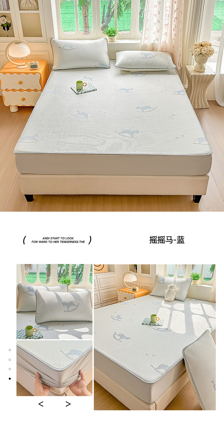 小萌虎 2026年新款乙纶PE提花冰豆豆凉席床笠款卡通 摇摇马-蓝
