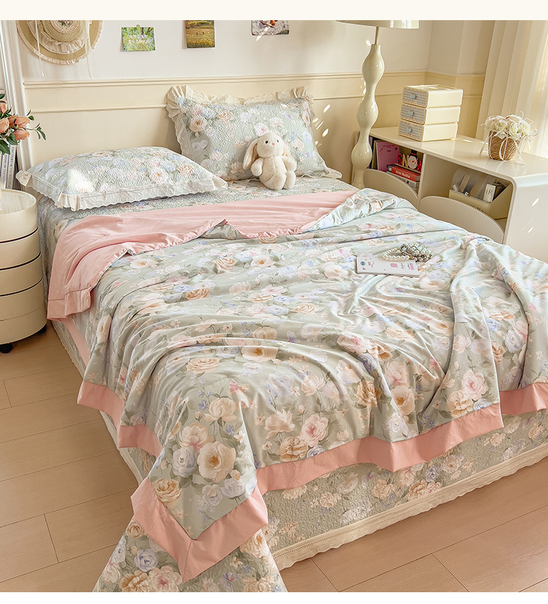 慕木家纺 2026新款A类印花慕丝棉花边款床盖夏被系列(抽空压缩可供跨境)提供买家秀 青妍+粉