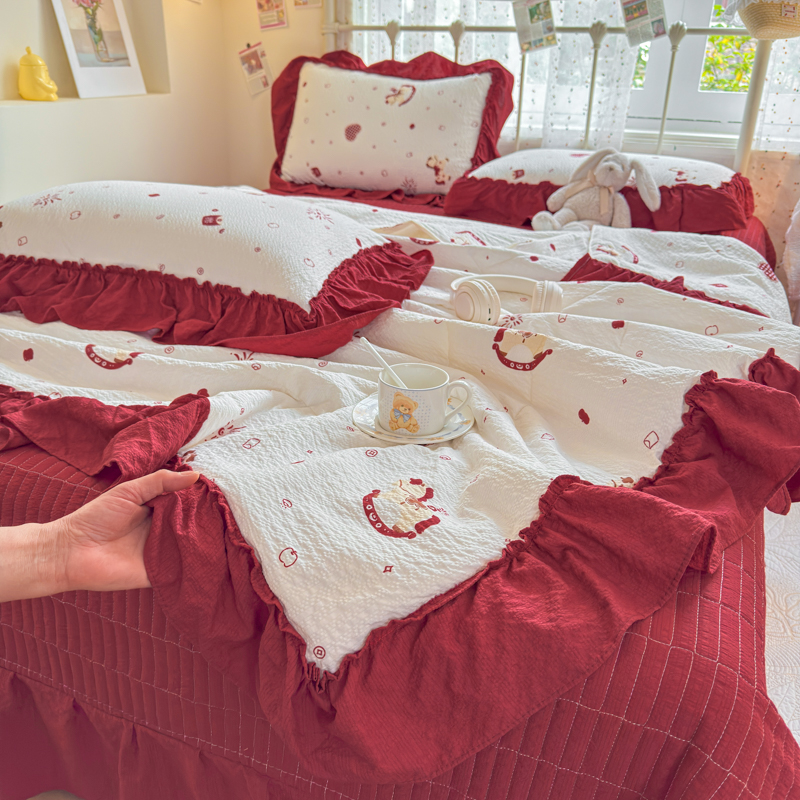 梵希雅 2026新款泡芙纱纯棉蕾丝花边夏被四件套 莓系花伐,莓系花伐