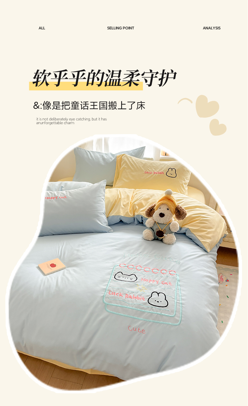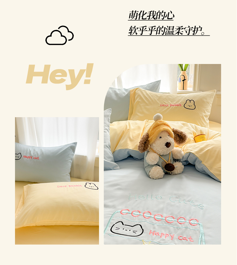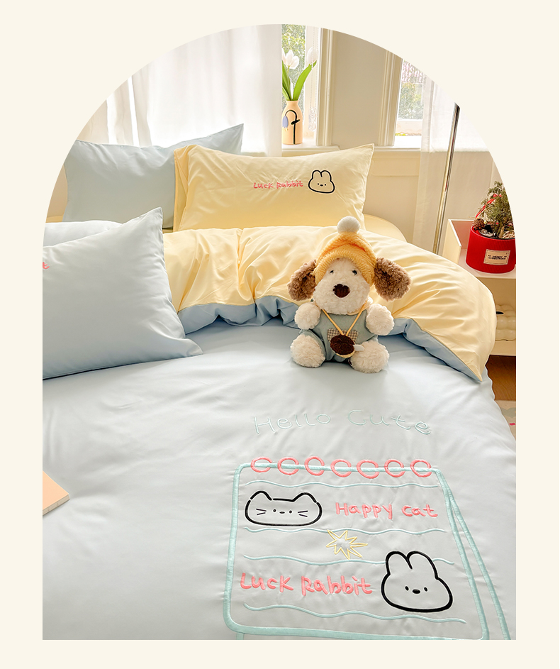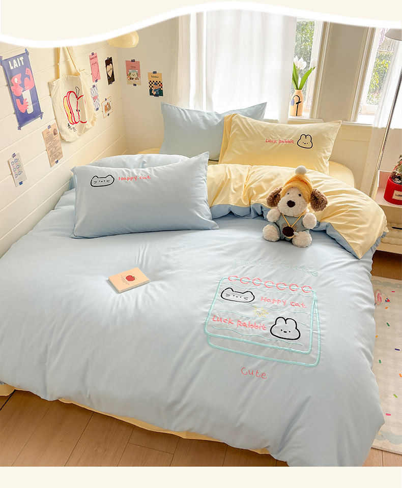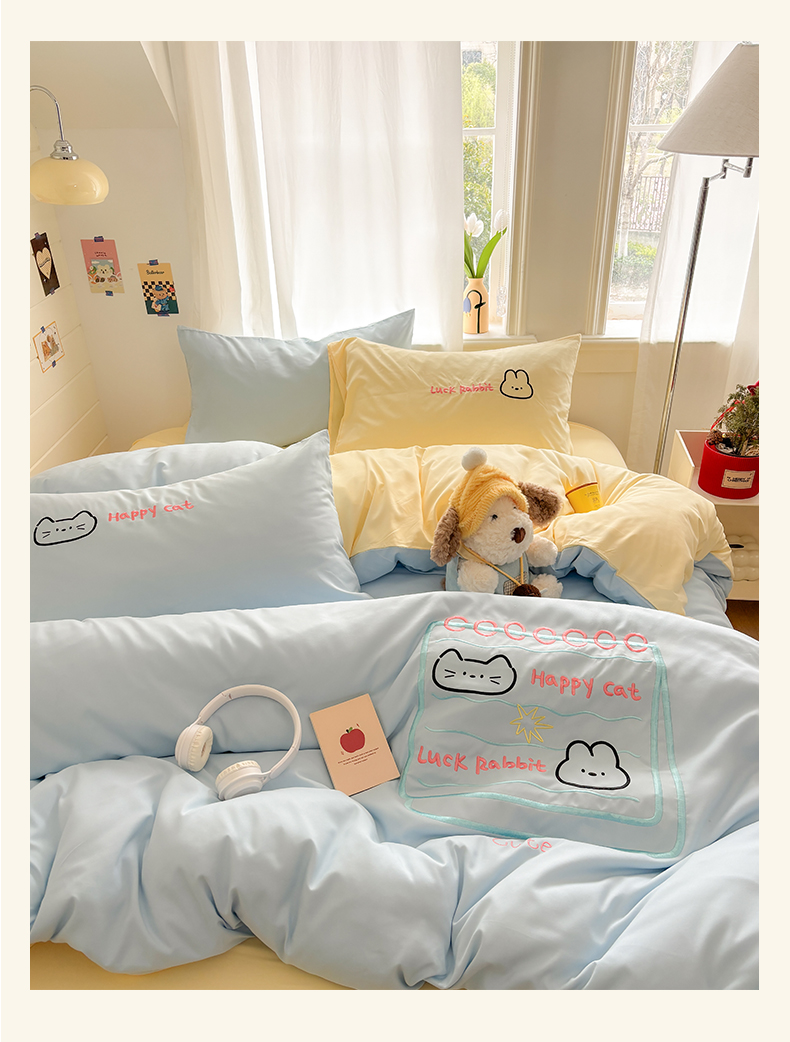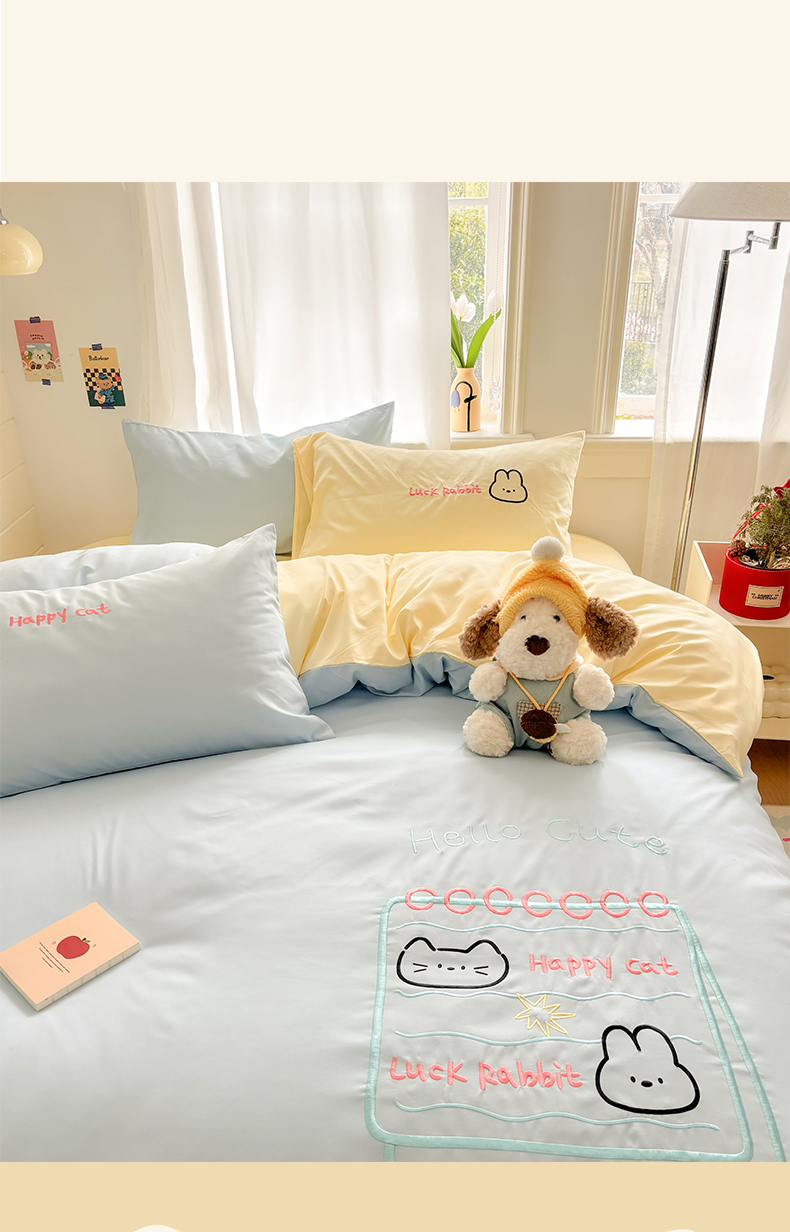 当前位置: 91家纺网 > 商品网购 > 床品套件 > 四件套 > 其它四件套 > 我心家纺 2026新款卡通刺绣四件套 猫兔日记-蓝黄
