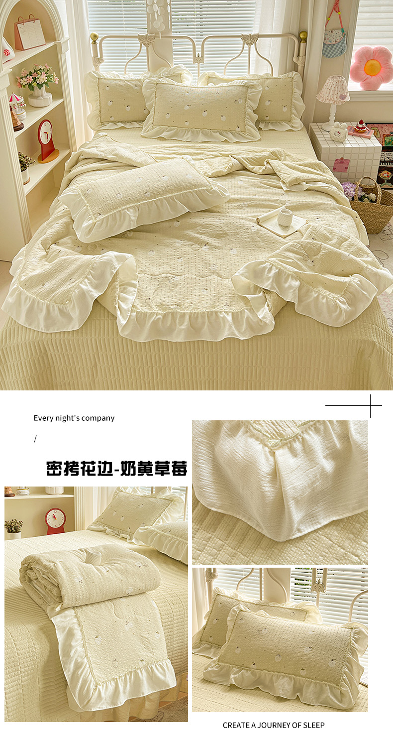 当前位置: 91家纺网 > 商品网购 > 床品套件 > 四件套 > 夏被四件套 > 富米莱(原臻工厂) 2026新款超温柔高弹线密拷花边款泡芙双层纱夏凉被床盖床裙四件套 组合图仅供展示-不可下单