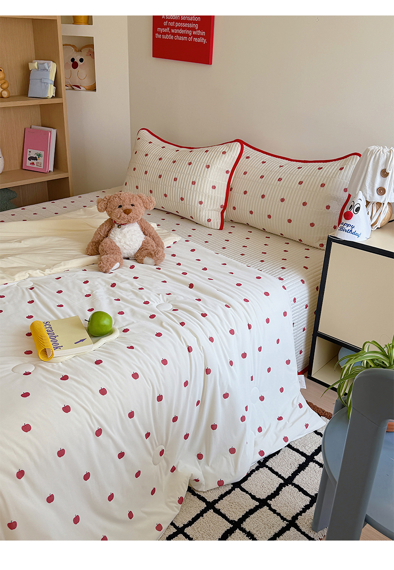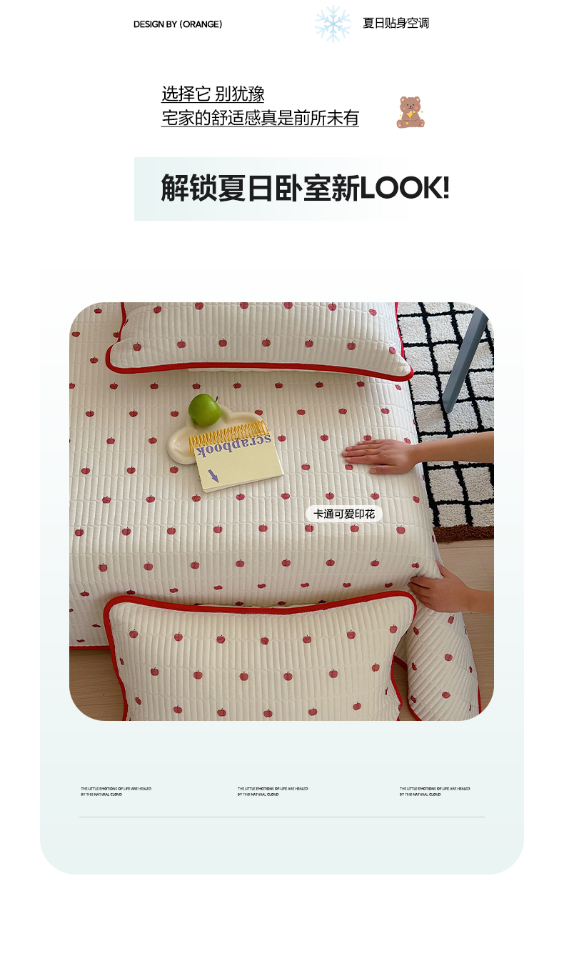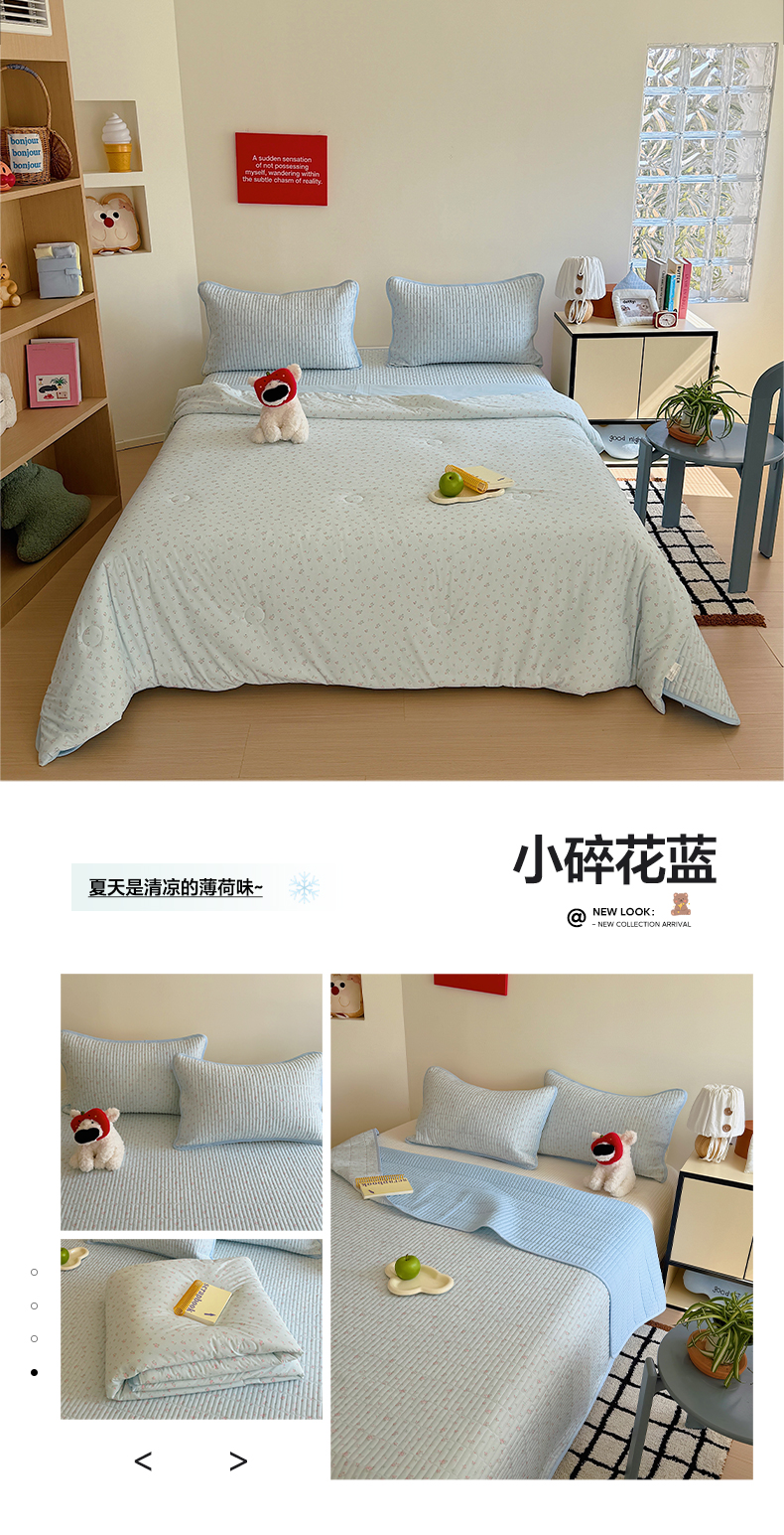 (总)美乐迪家纺 2026春夏新款水光冰丝床盖夏被夏凉被空调被四件套,组合图仅供展示不可下单,彩色小花,粉色费尔岛,粉色小熊,苹果,小草莓,小碎花蓝,星星猫咪,樱桃粉,樱桃蓝