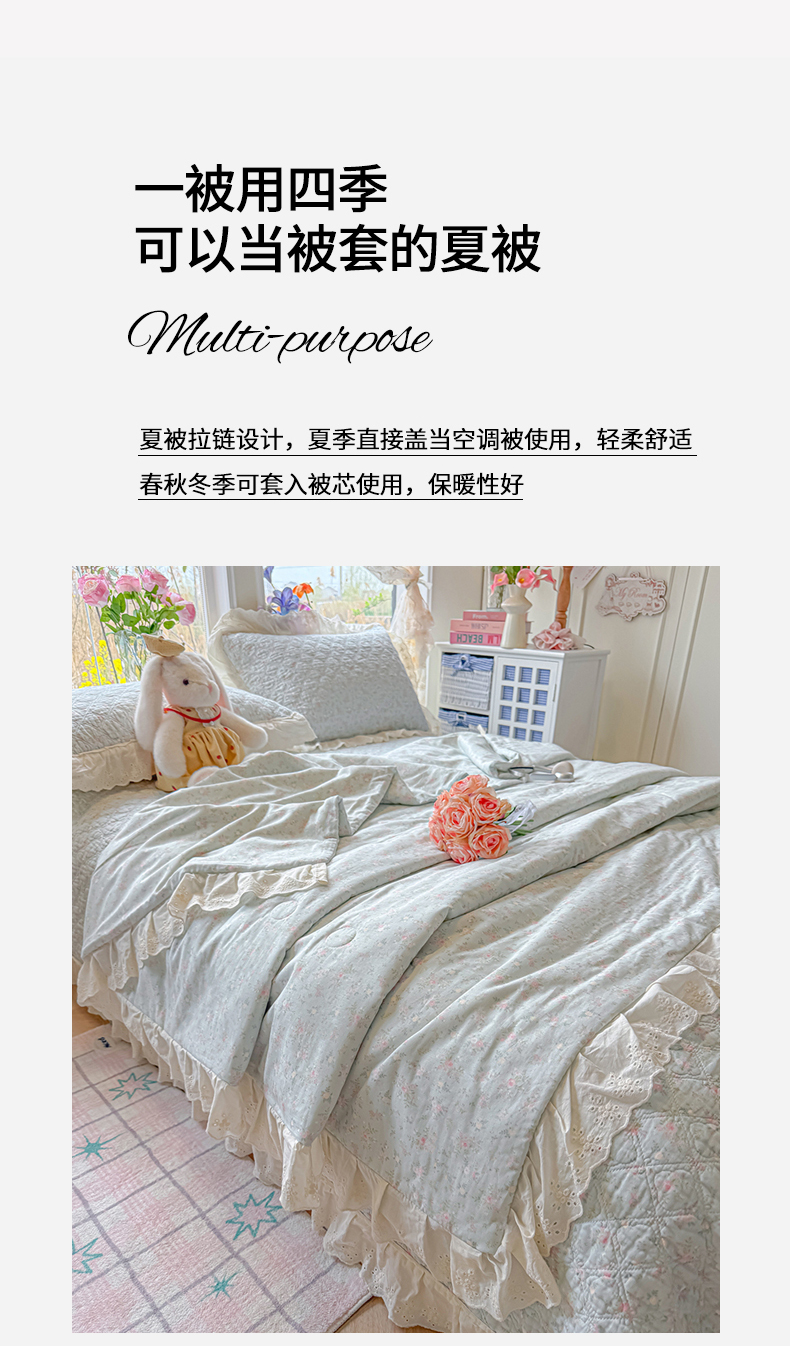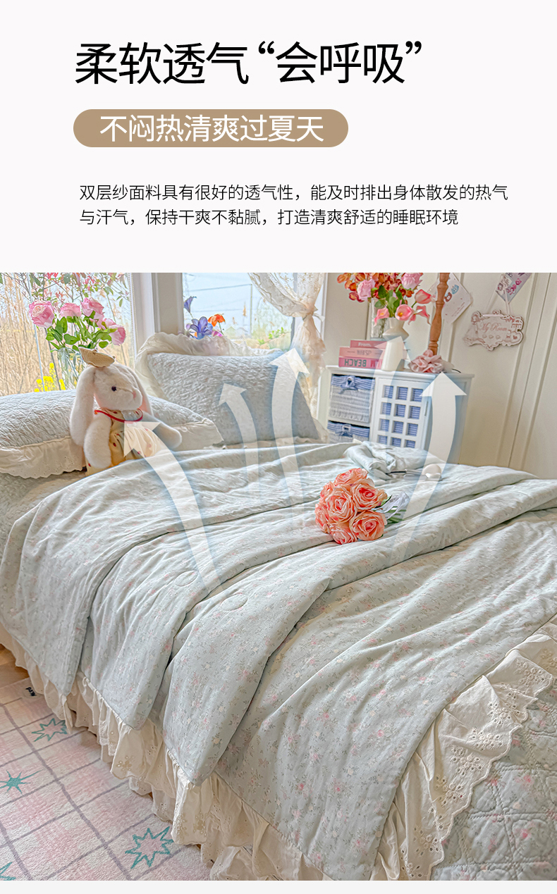 (总)慕晨 2026新款大花边全棉双层纱多功能夏凉被床盖四件套高温水洗床盖夹棉三件套,栗色蔷薇,奶糖兔,柔蓝花,浅灰枝语,奶油小黄花,海盐莓语,草莓奶昔,冰蓝星,松雾花,桃雾,樱落雪