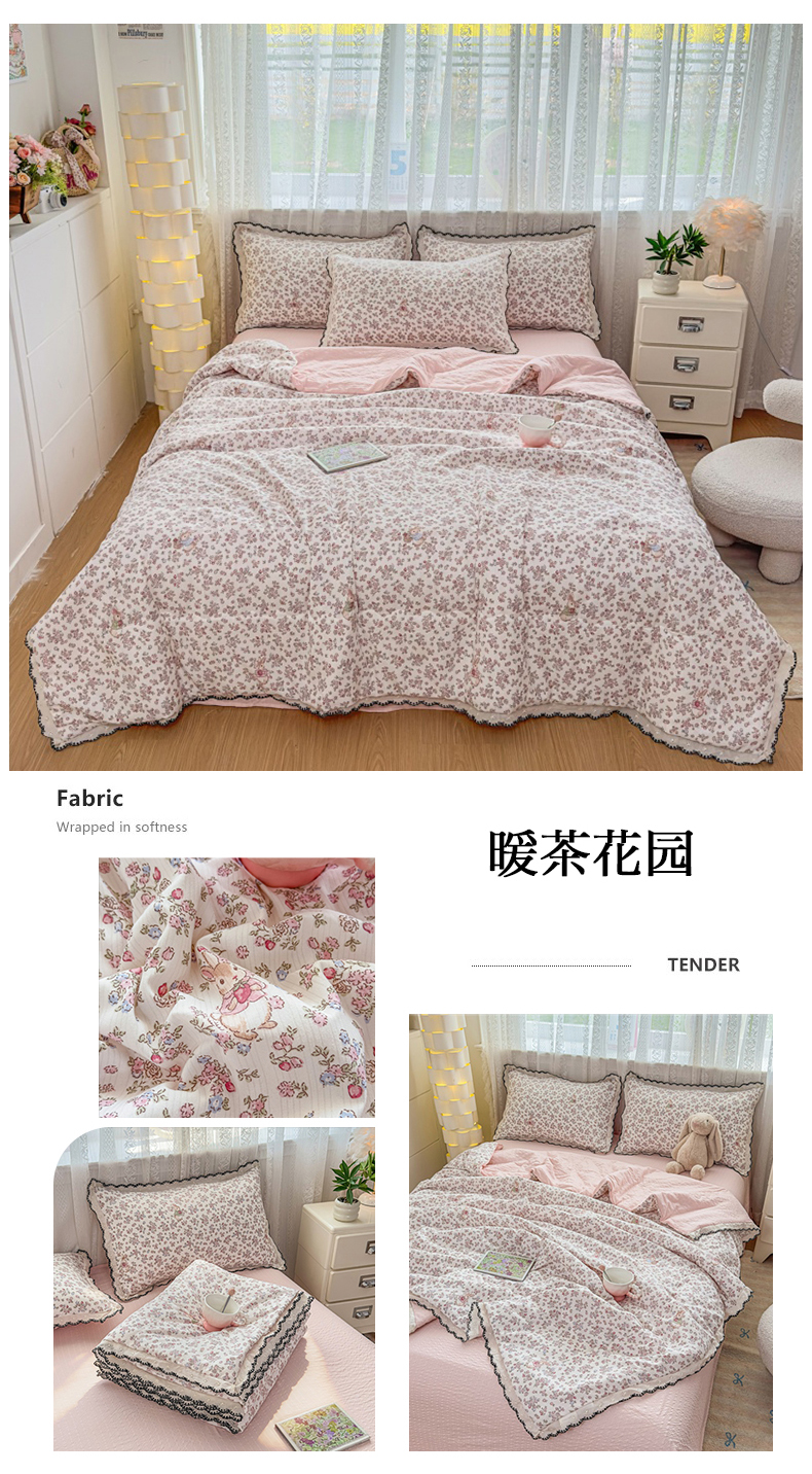 商品名称:赫本家纺 2026新款全棉镂空花边云感印花双层纱夏被四件套 暖茶花园
