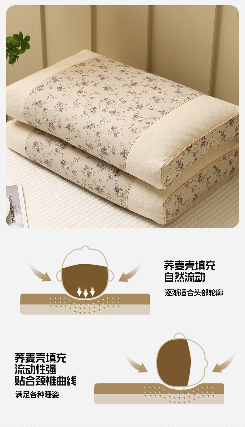 商品名称:梦叶草 2026新款全棉小碎花宫廷荞麦枕头枕芯 宫廷荞麦枕-小碎花咖