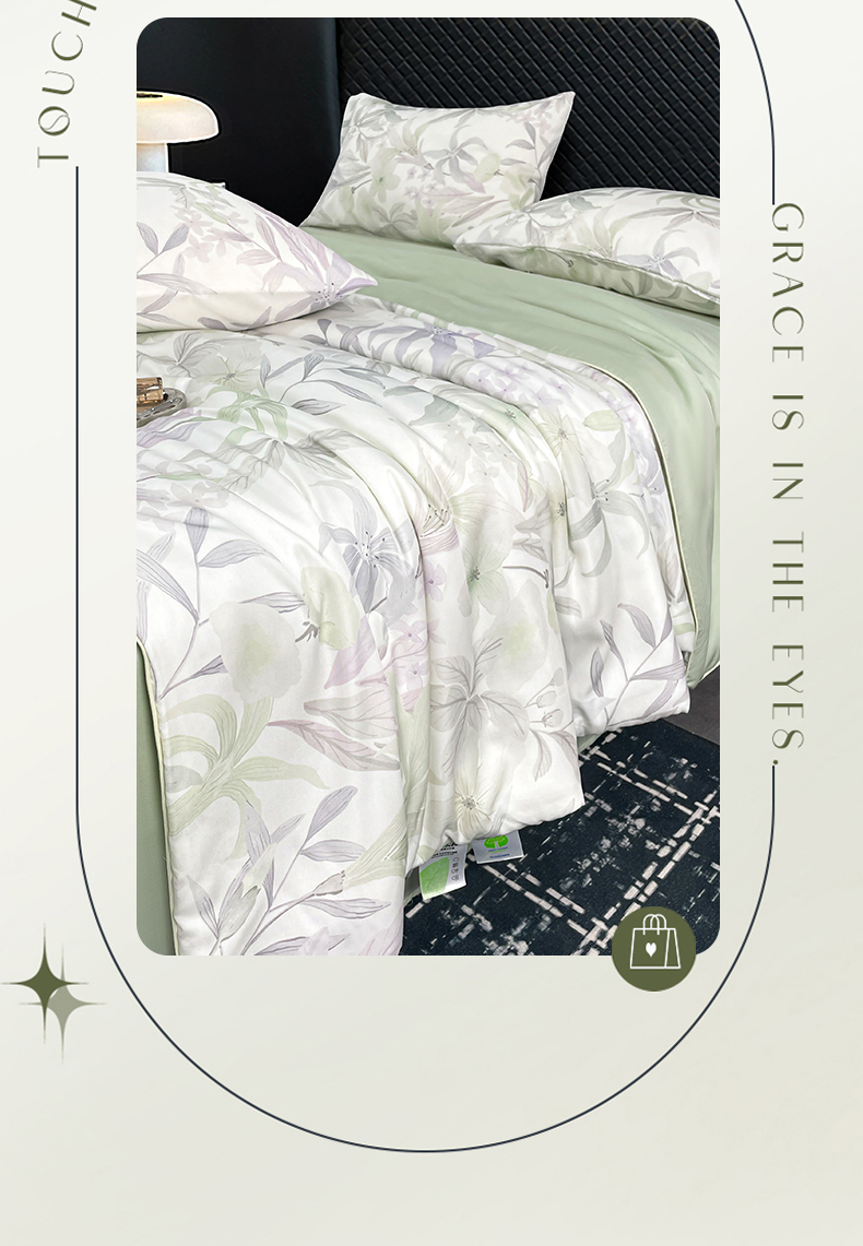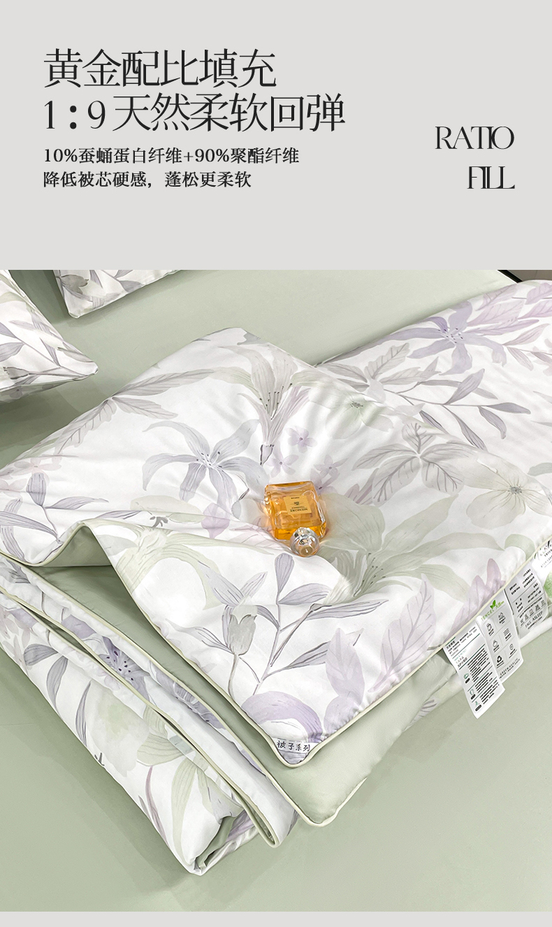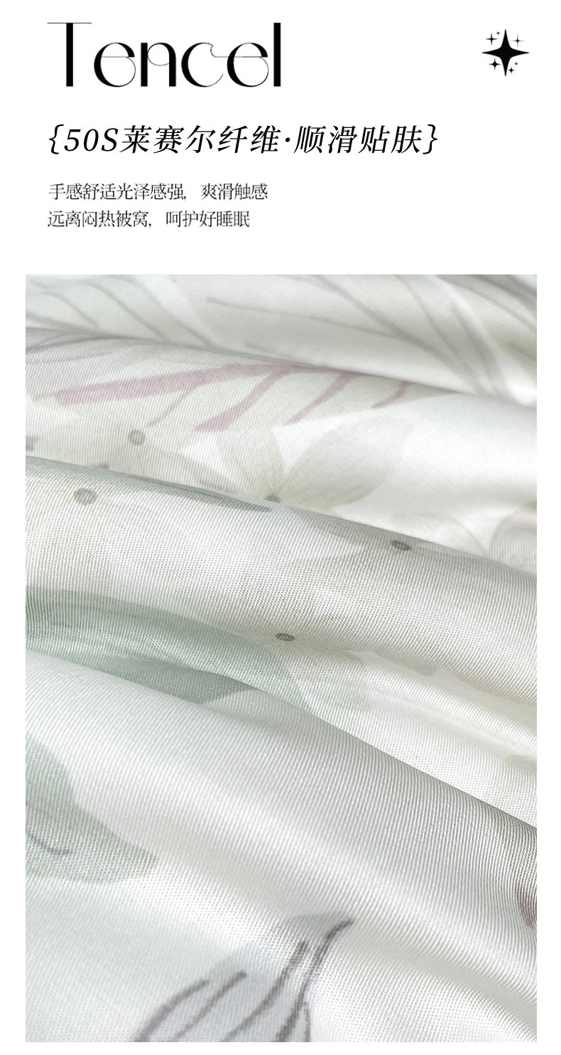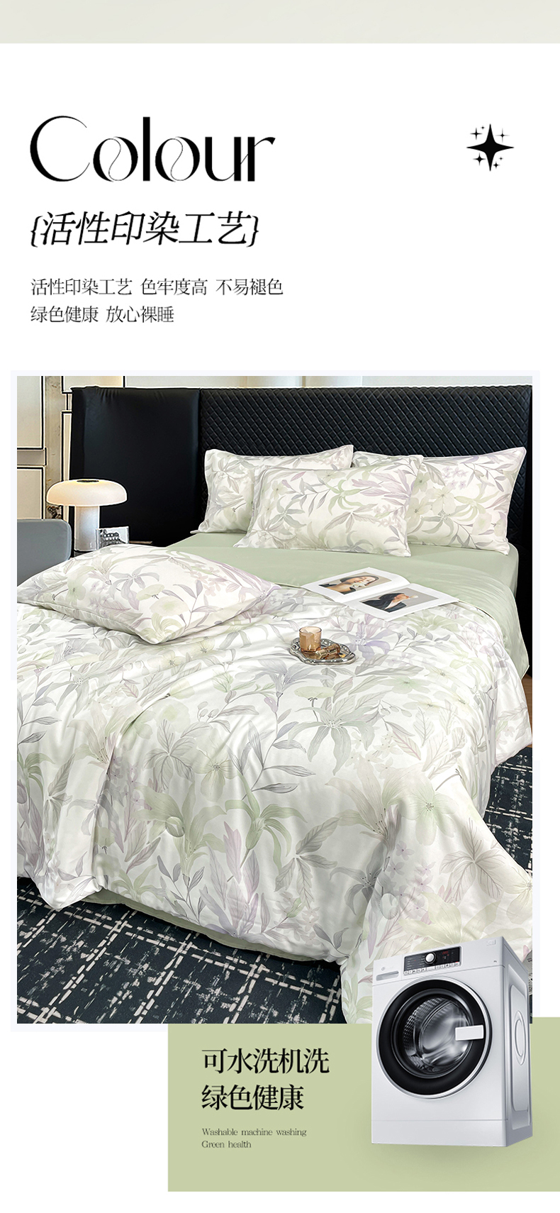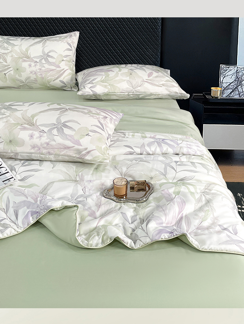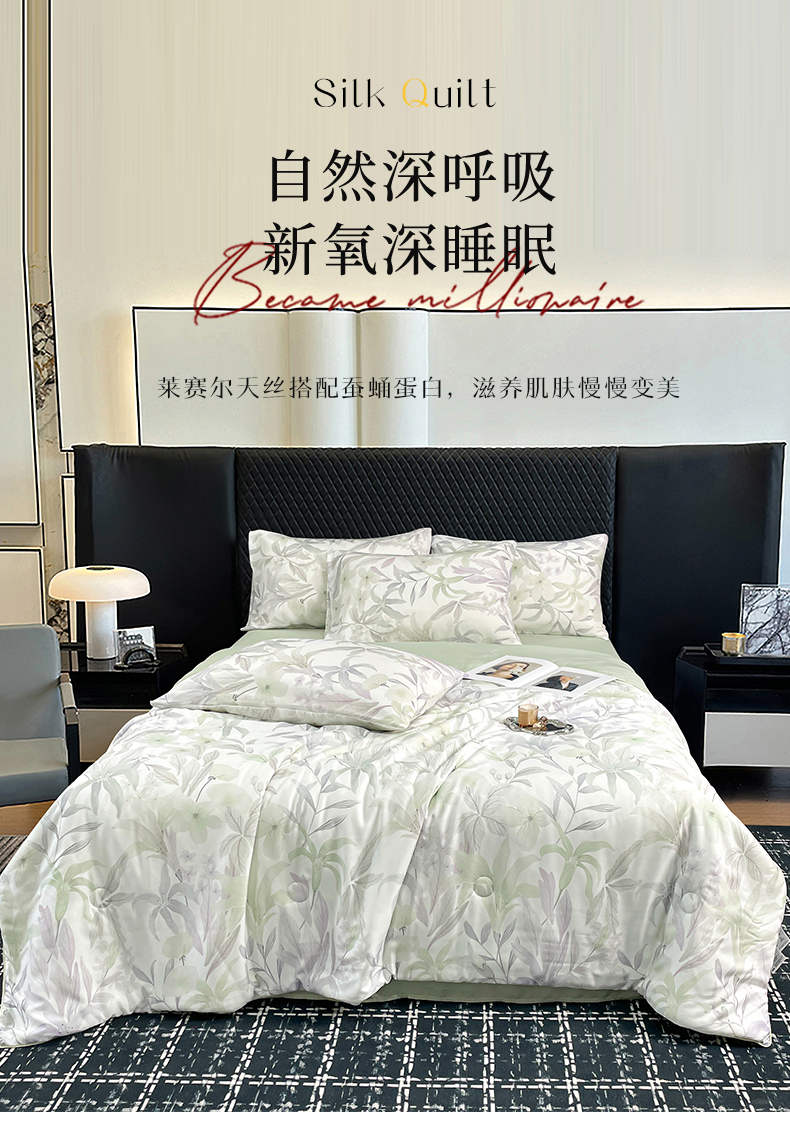 • 91家纺网 家纺一手货源 找家纺 尊妙被业 2026春夏新款莱赛尔天丝夏被蚕蛹蛋白夏被夏凉被空调被四件套-印花款 自然低语-绿