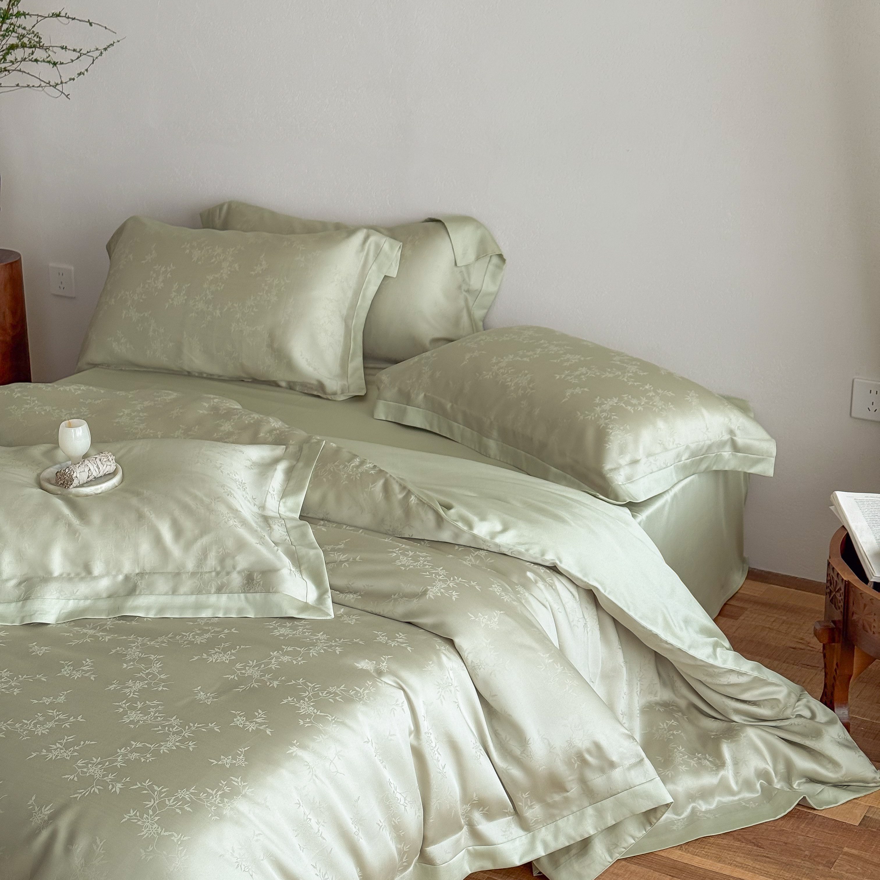 (总)花时间 2026春夏新款60s兰精天丝染色提花四件套,柒予-春绿,悠野-香槟