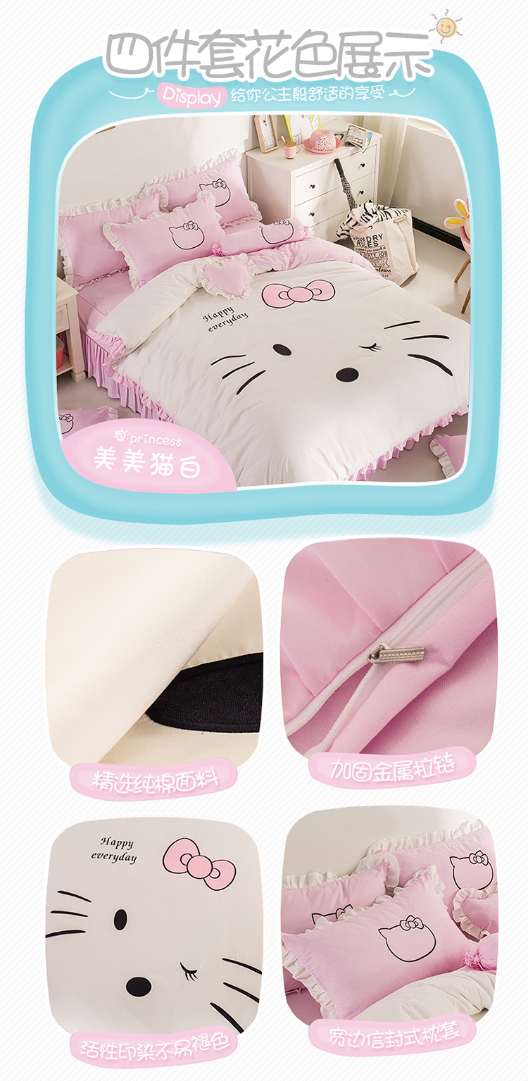 欧冠家纺 水洗磨毛卡通床裙款四件套 美美猫白