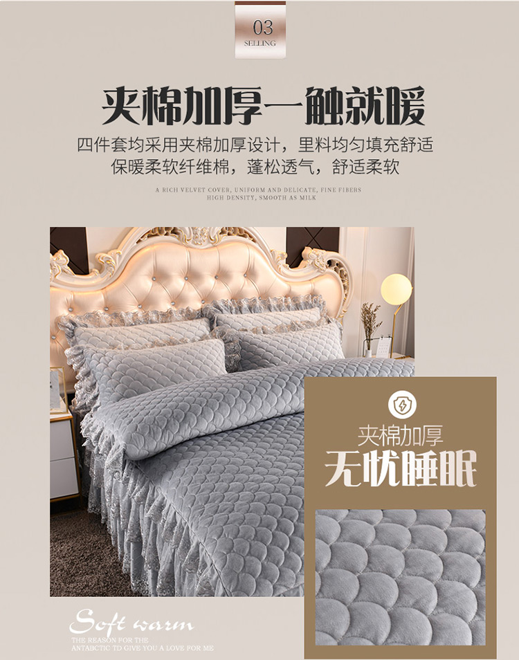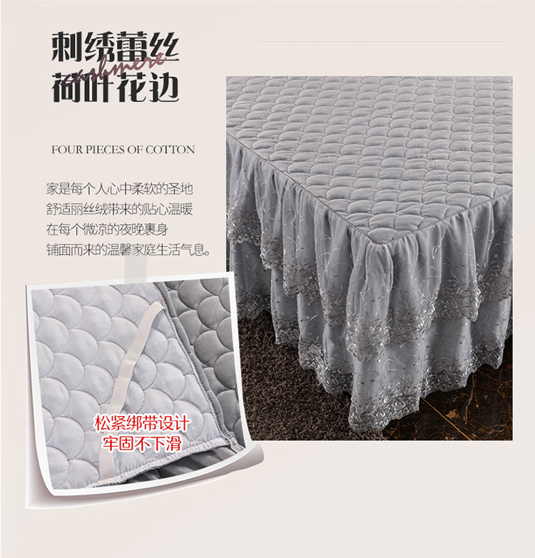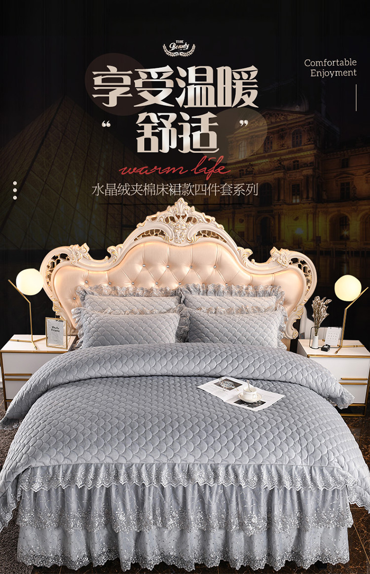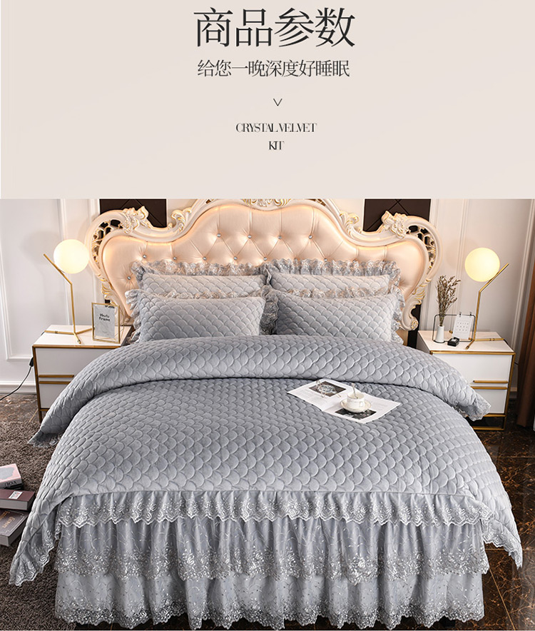 商品名称:恒爱家纺2021新款水晶绒夹棉蕾丝四件套 翩翩花舞-浅灰色