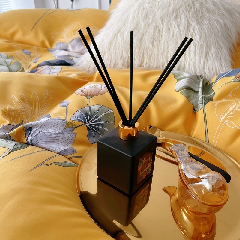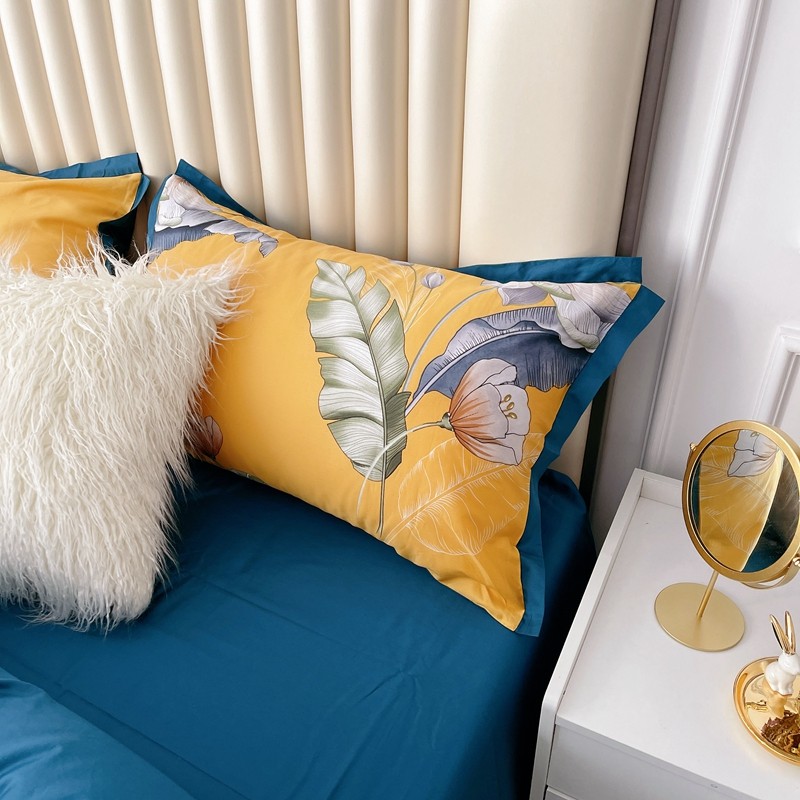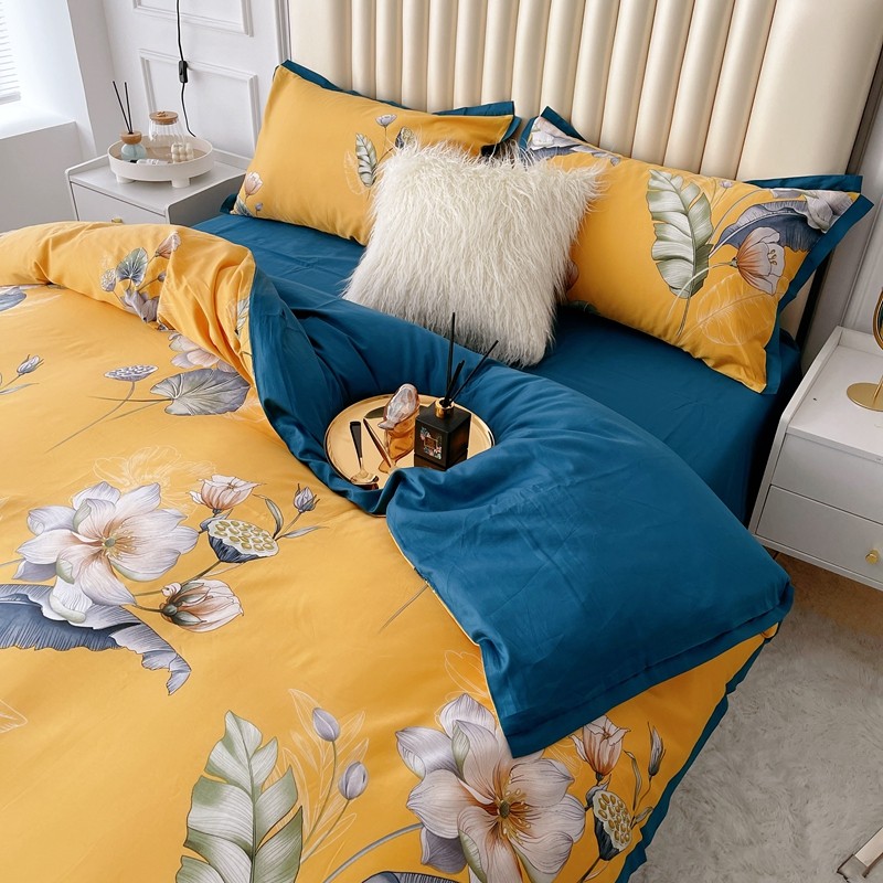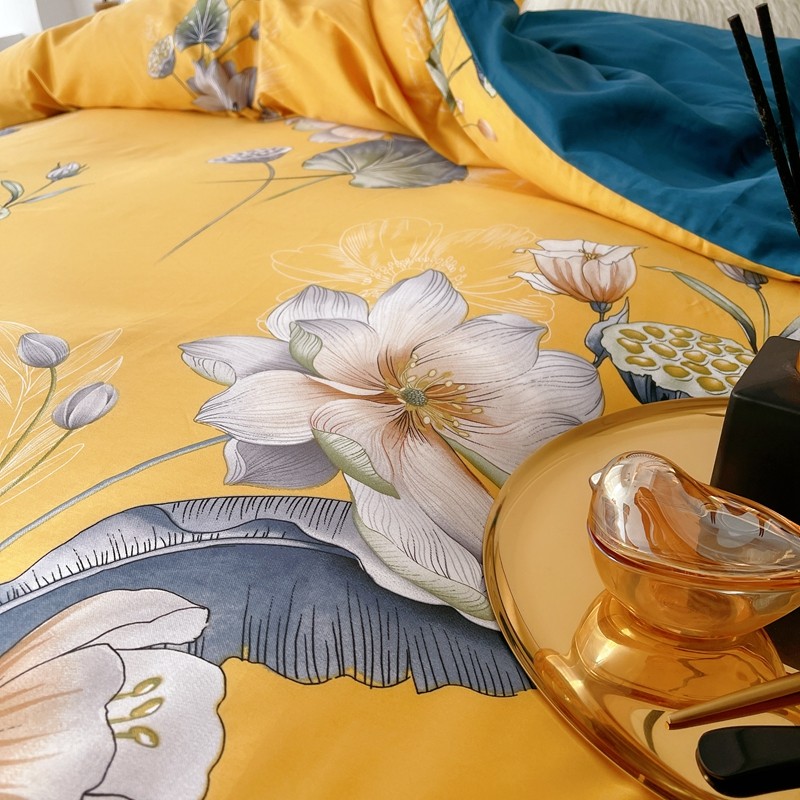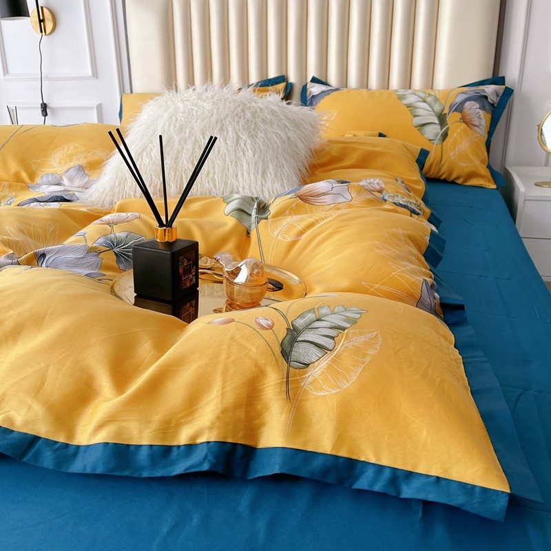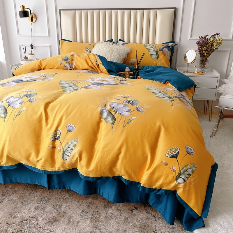 蘭菲2023新款60支贡缎长绒棉印花美式花卉四件套荷叶罗裙黄