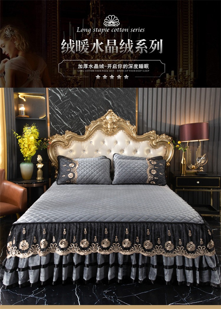 (总)能好家纺 2025新款蕾丝工艺水晶绒夹棉床裙,宝石兰,藏青,豆沙,粉玉,灰,酒红,墨绿,月光蓝