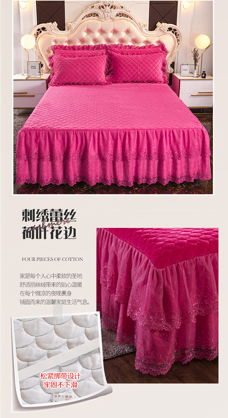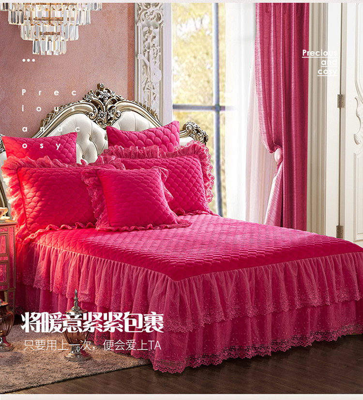 恒爱 2021新款水晶绒夹棉刺绣单床裙 翩翩花舞-枚红色