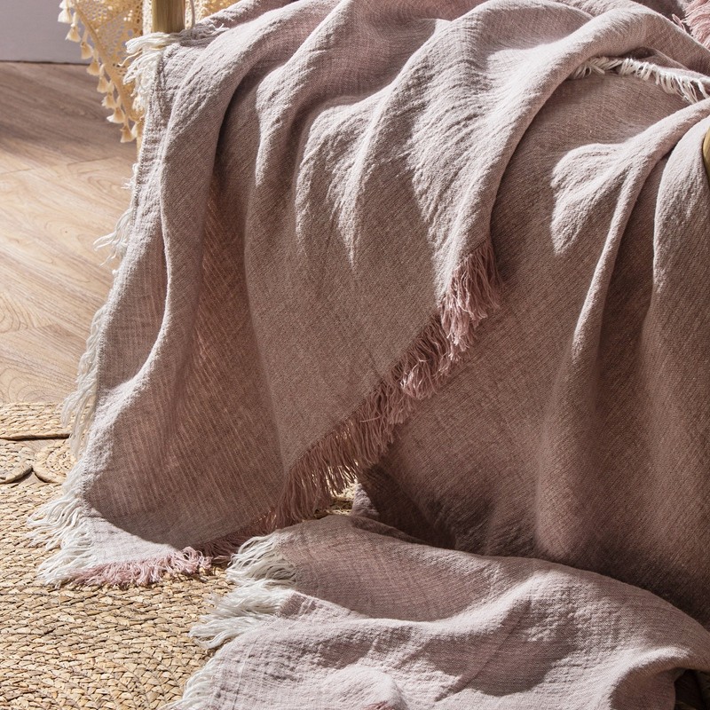 简家居 2022新款纯亚麻流苏盖毯 皮粉色