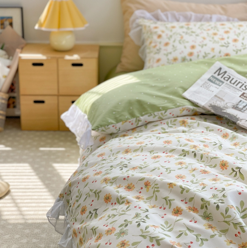 (总)觅糖家纺 2025新款牛奶绒荷叶边小小系列四件套,小小爱心白,小小樱桃酱