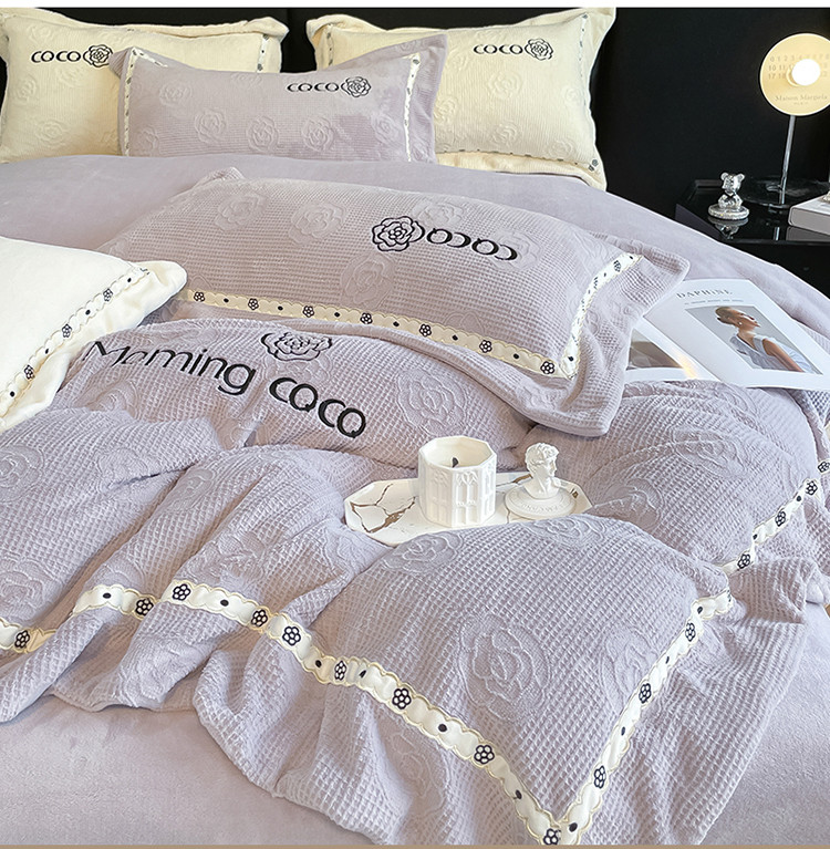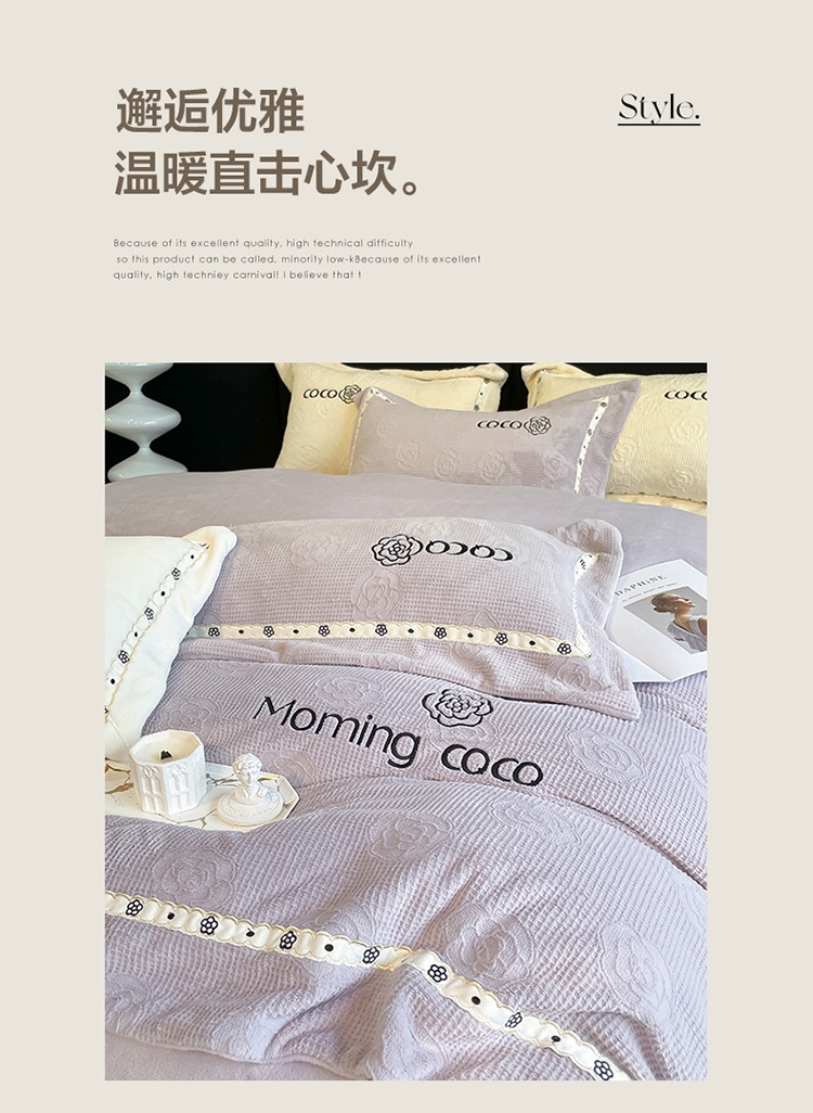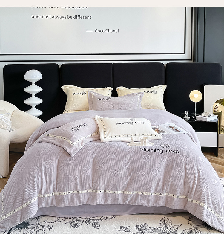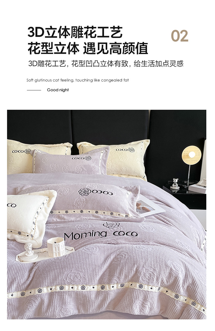 商品名称:祺瑞佳 2023 花颜-A类母婴 高克重超柔牛奶绒婴儿绒雕花烂花 刺绣绣花四件套 朝晖