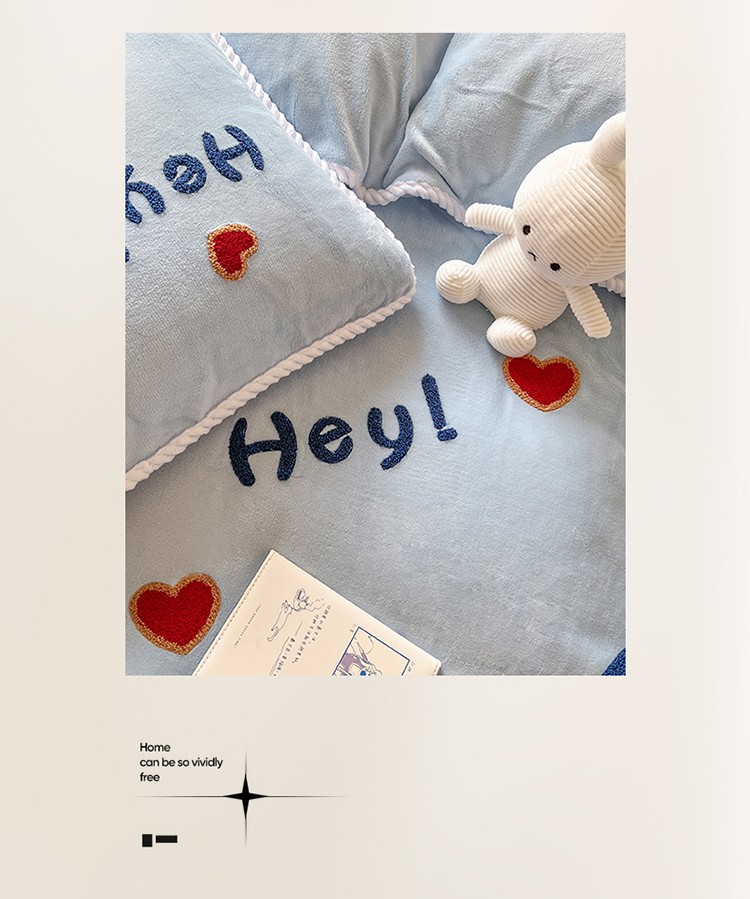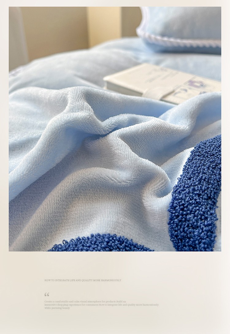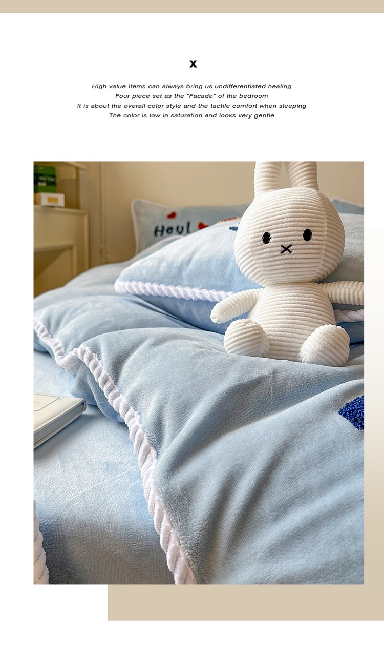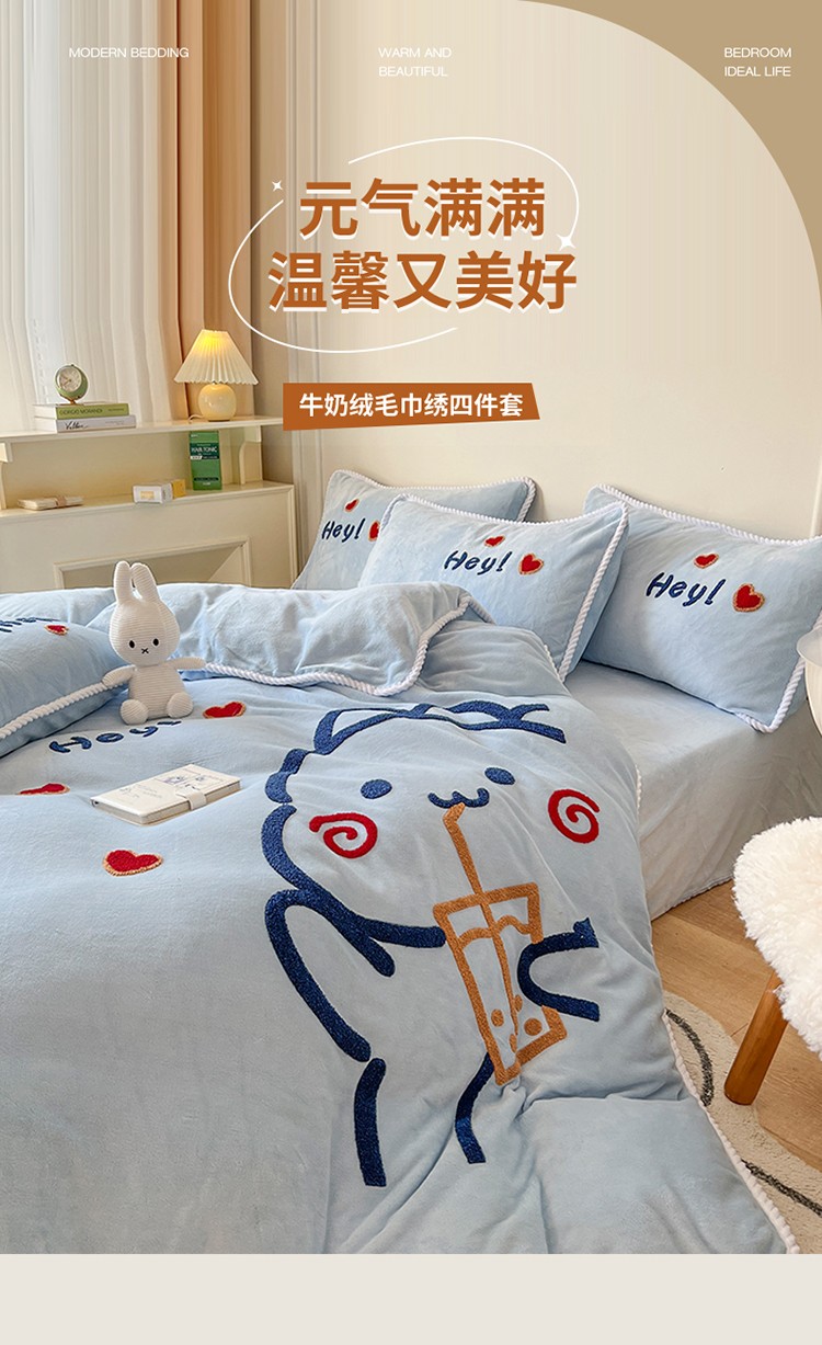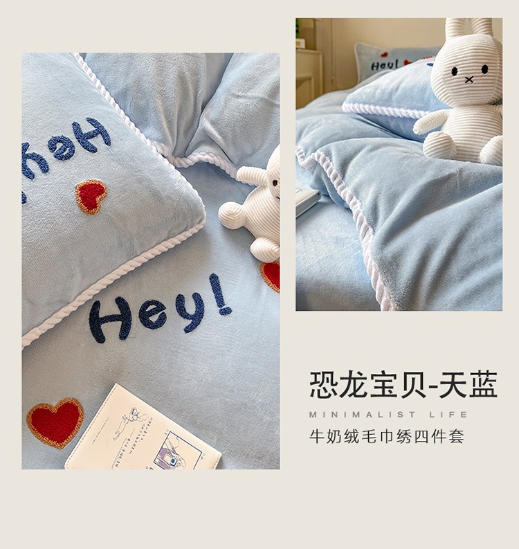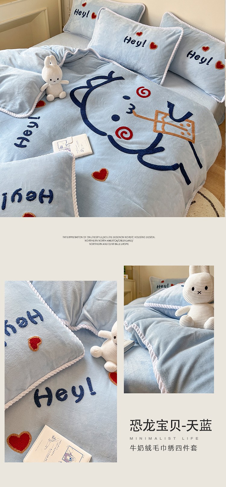 芯贝儿 新款加厚保暖雕花牛奶绒毛巾绣花宝宝法莱绒四件套 恐龙宝贝-天蓝