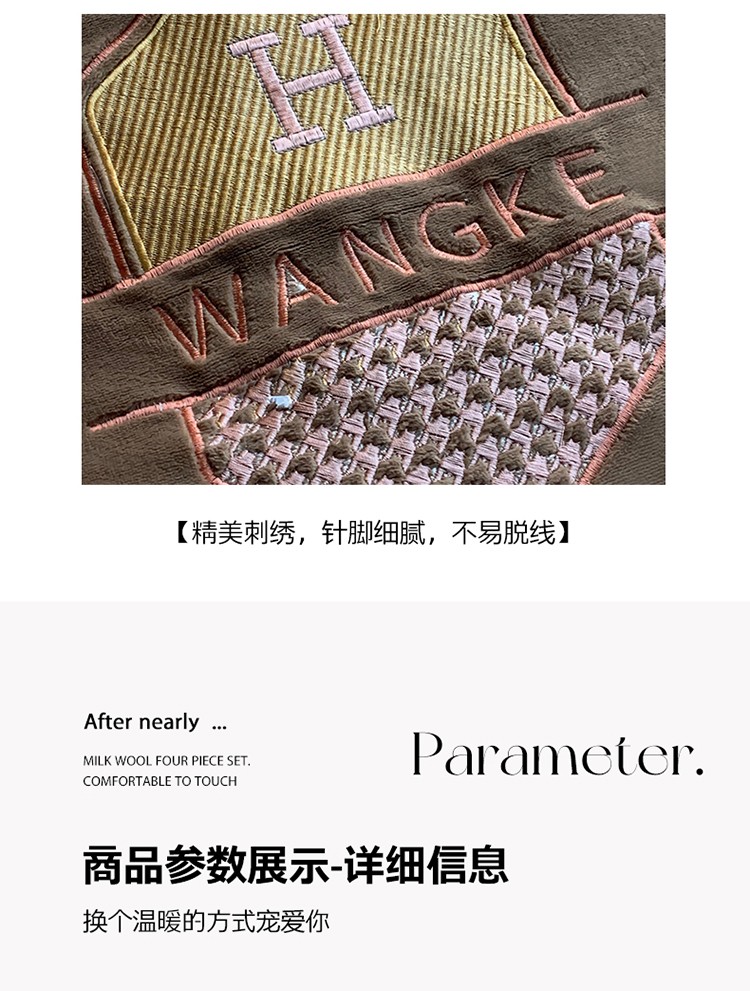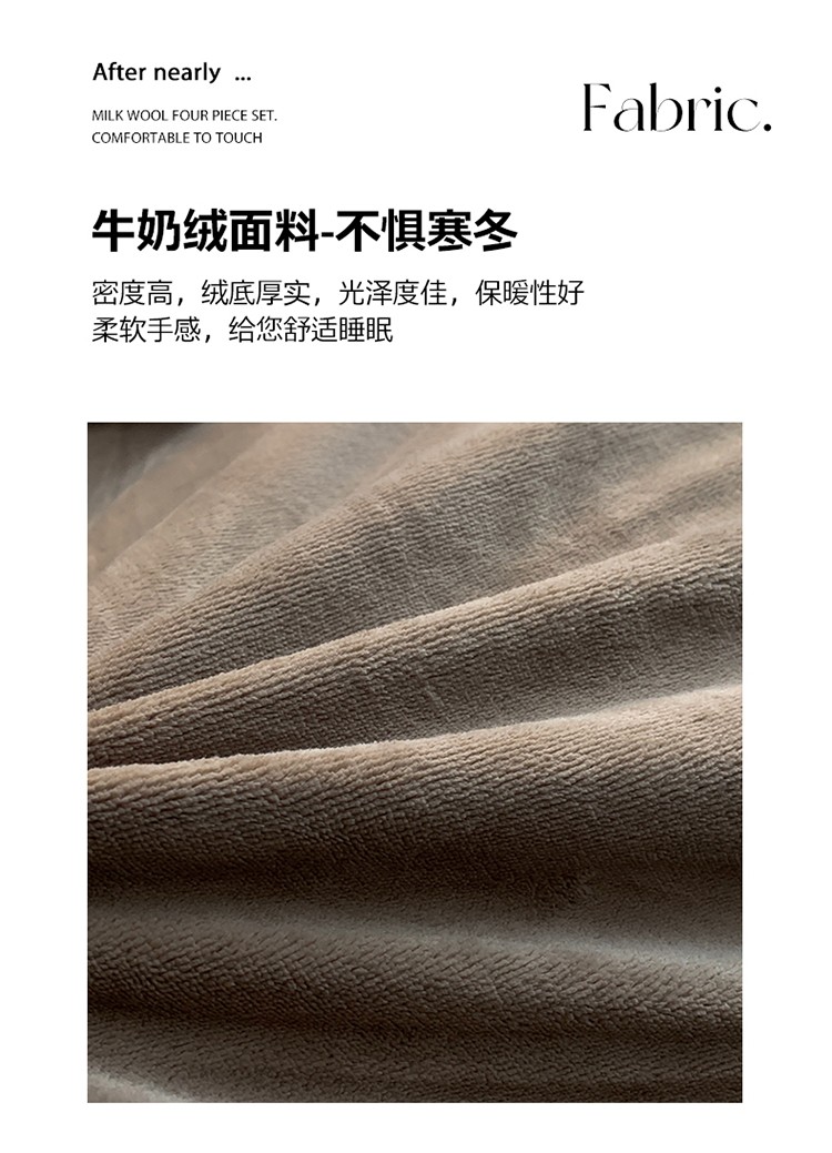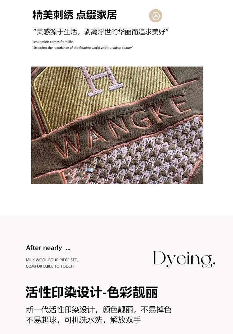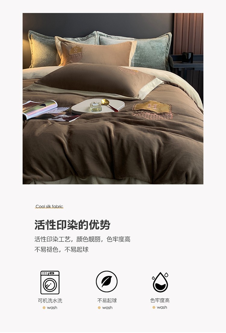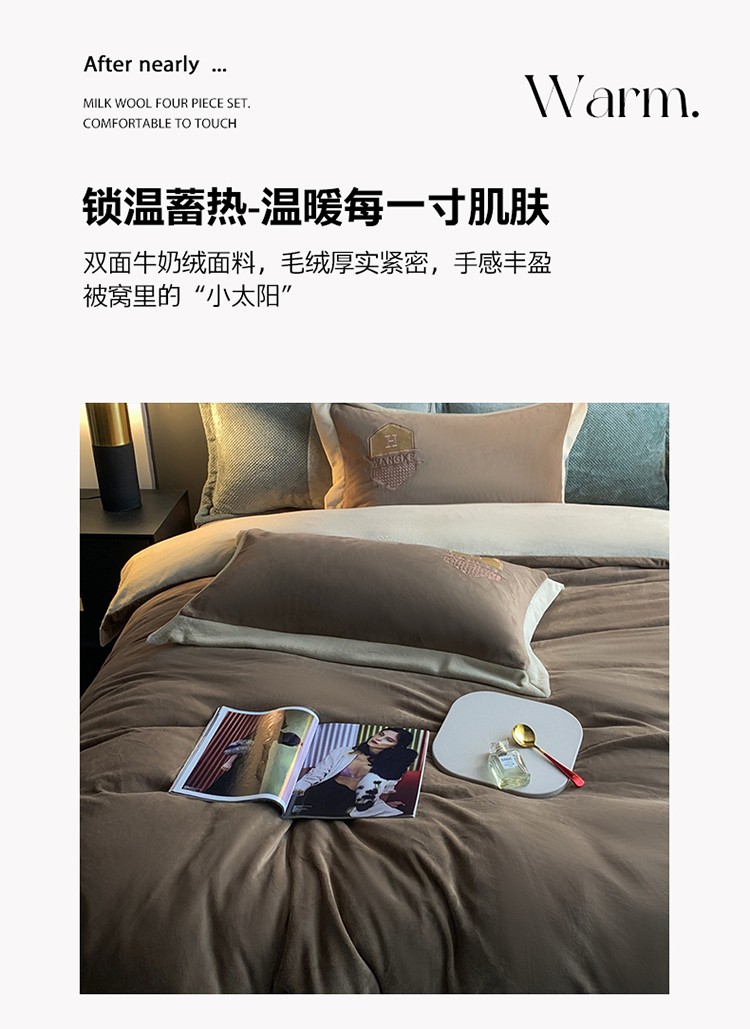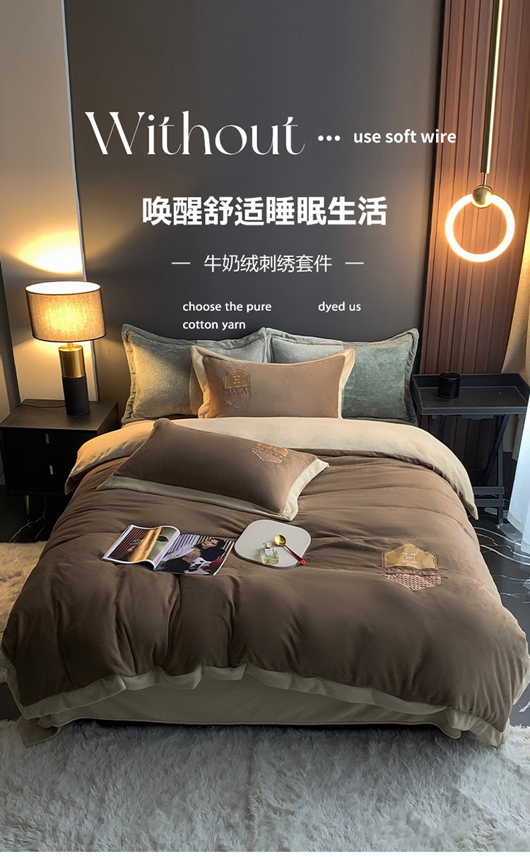 当前位置: 91家纺网 > 商品网购 > 床品套件 > 四件套 > 牛奶绒四件套 > 网客 2024新款牛奶绒四件套拼色绣花系列 奶咖