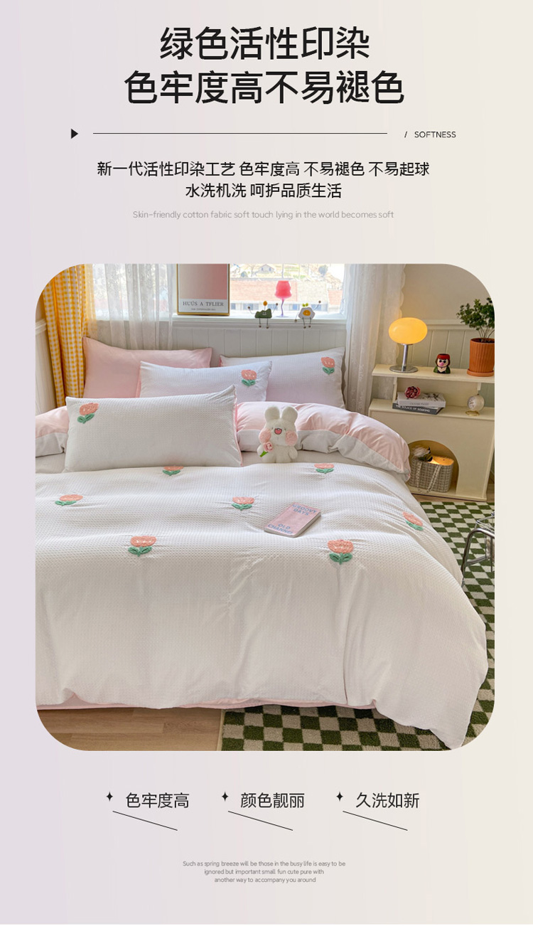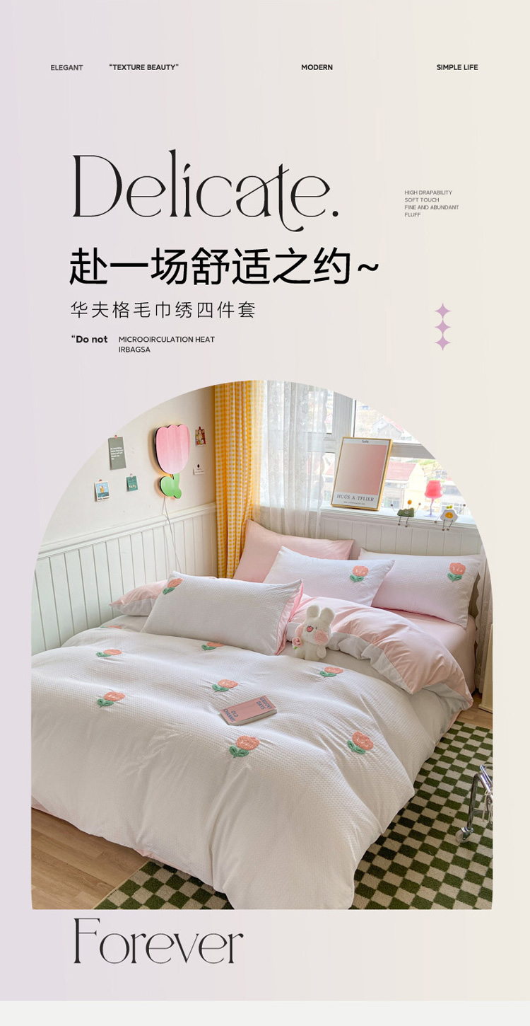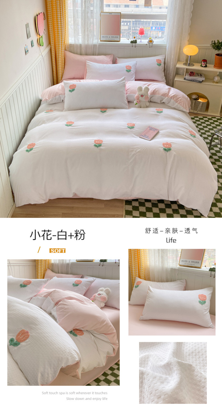 商品名称:慕澄 2023新款高克重小清新华夫格毛巾绣系列四件套 小花-白+粉