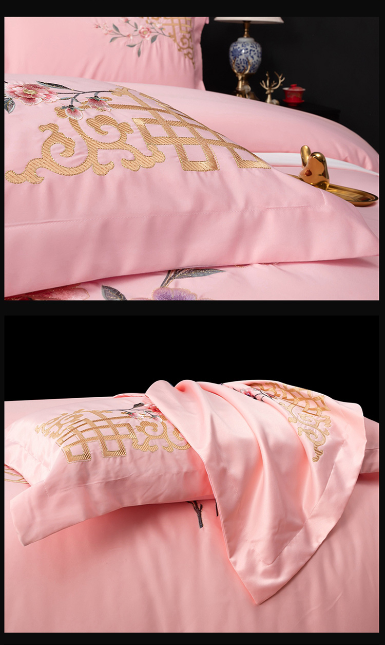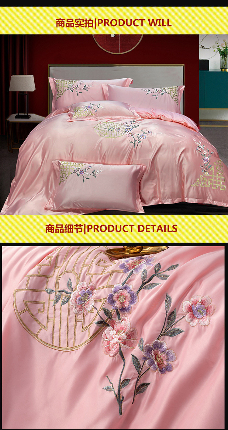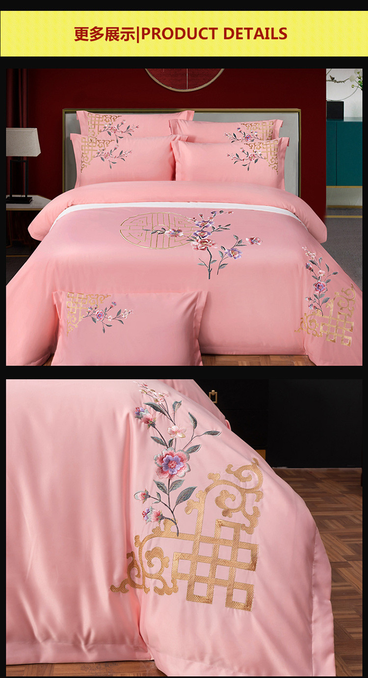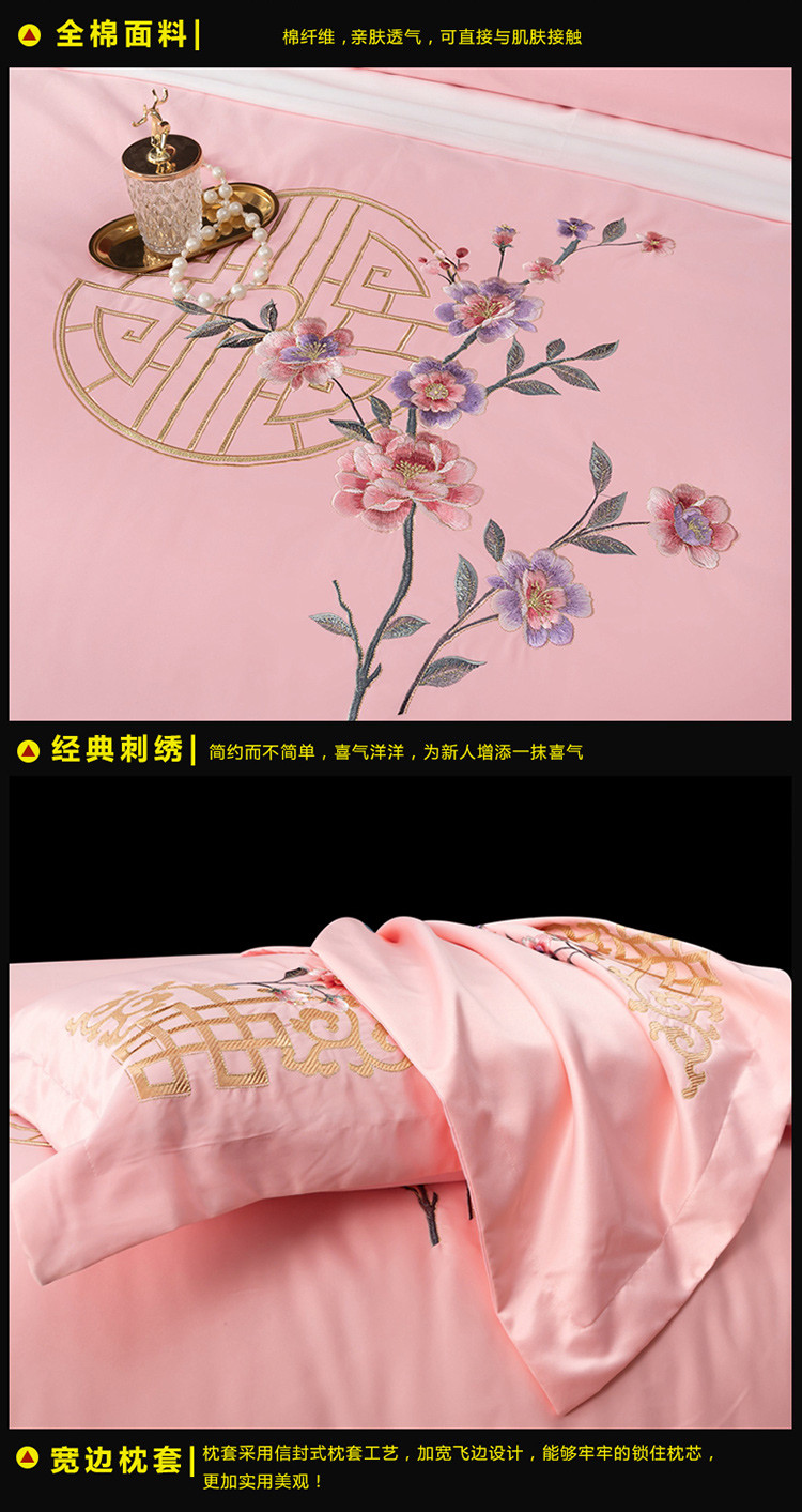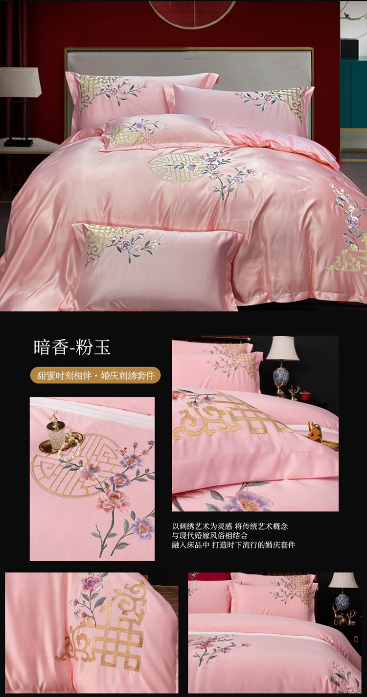 商品名称:慕她婚庆四件套大红色结婚全棉纯棉刺绣花多件套直播 暗香粉玉