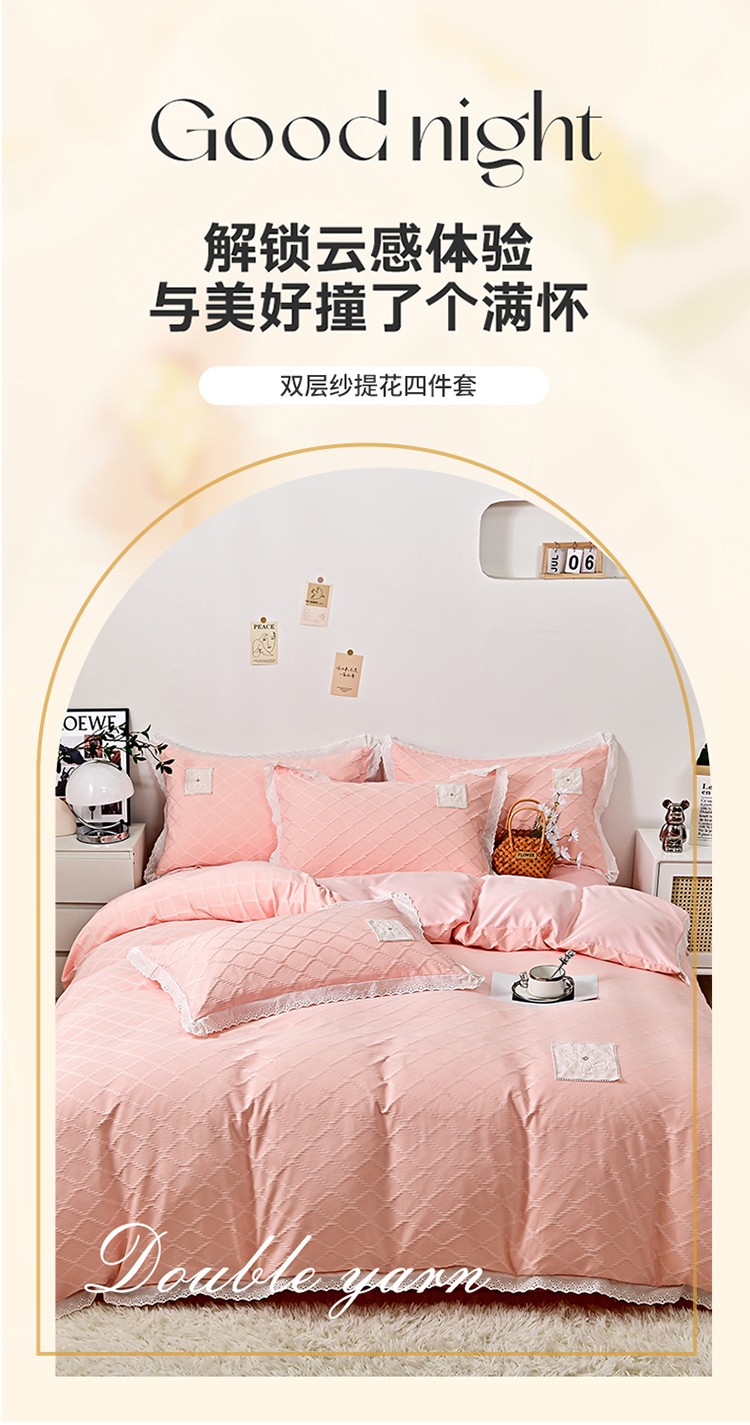 宅家居 2023新款双层纱菱形格贴布绣花边四件套-罗威系列 罗威-桃粉