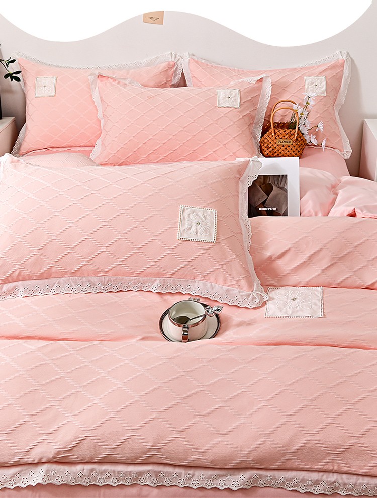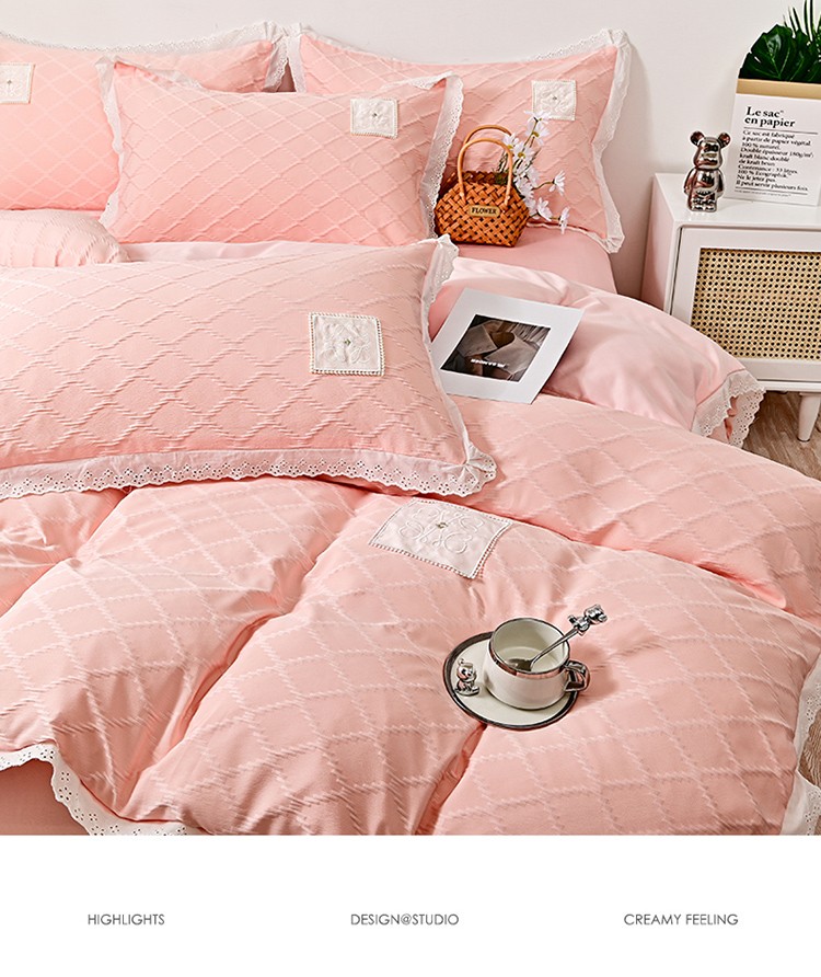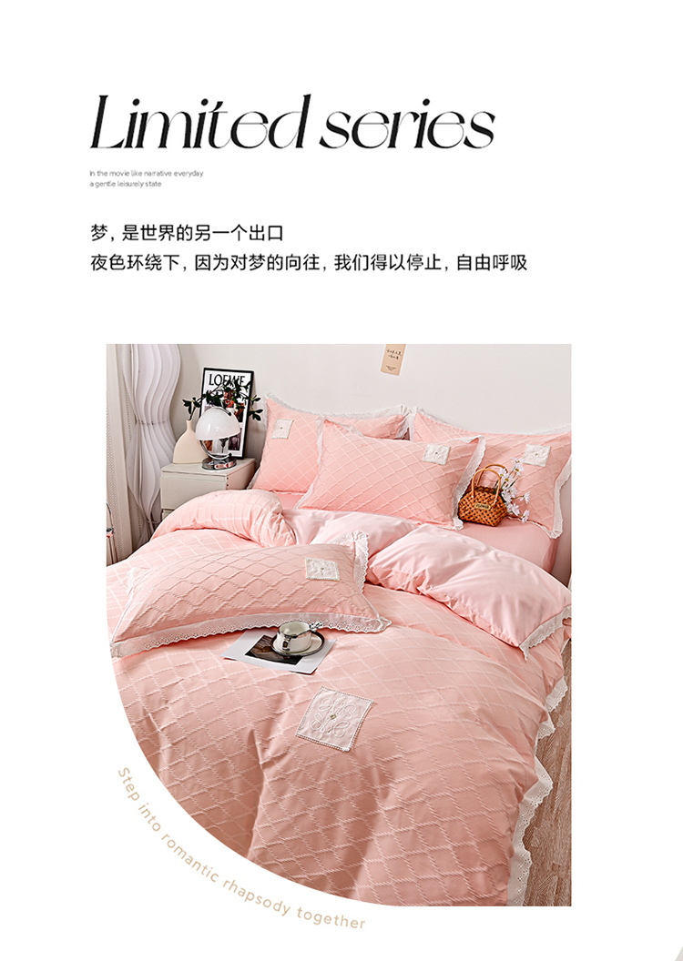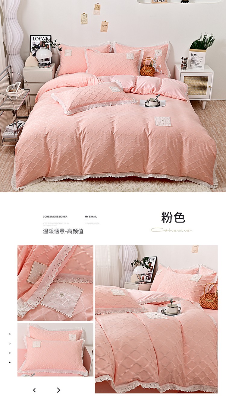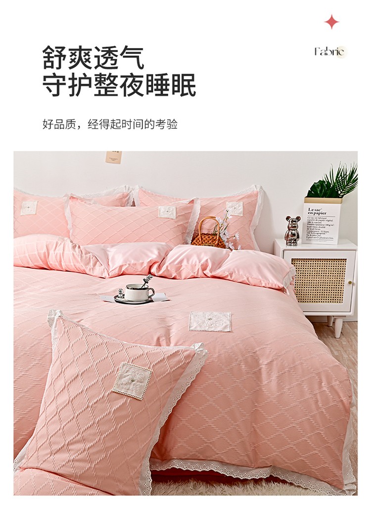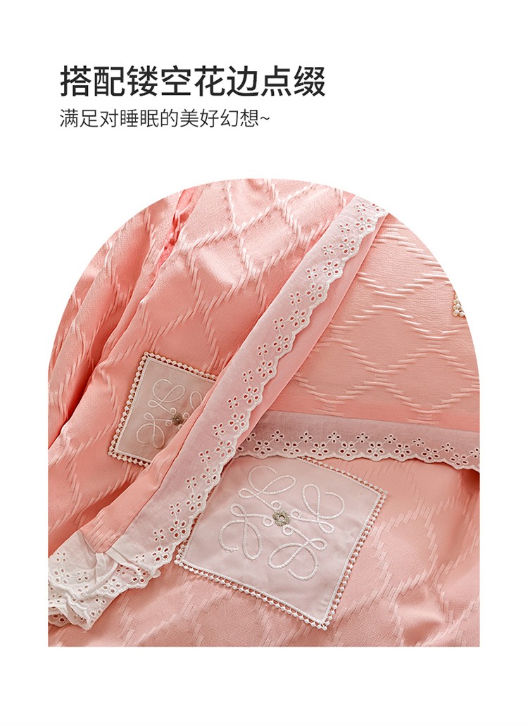 商品名称:宅家居 2023新款双层纱菱形格贴布绣花边四件套-罗威系列 罗威-桃粉