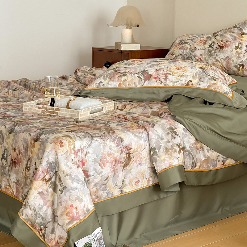 (总)优然居家纺 2025新款50支全棉纯棉印花法式双头木耳边四件套,觅棠,莫妮卡艾绿,莫妮卡罗兰,慕斯粉,薇薇安