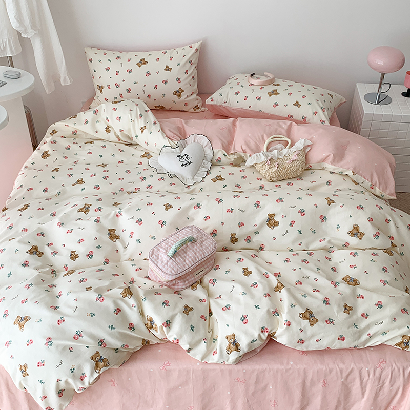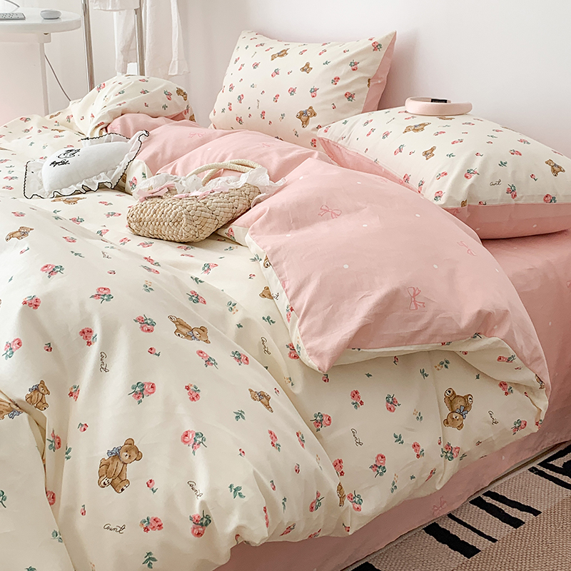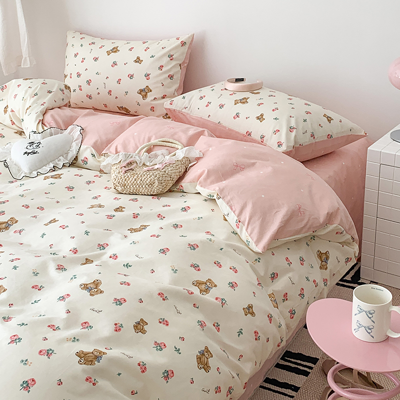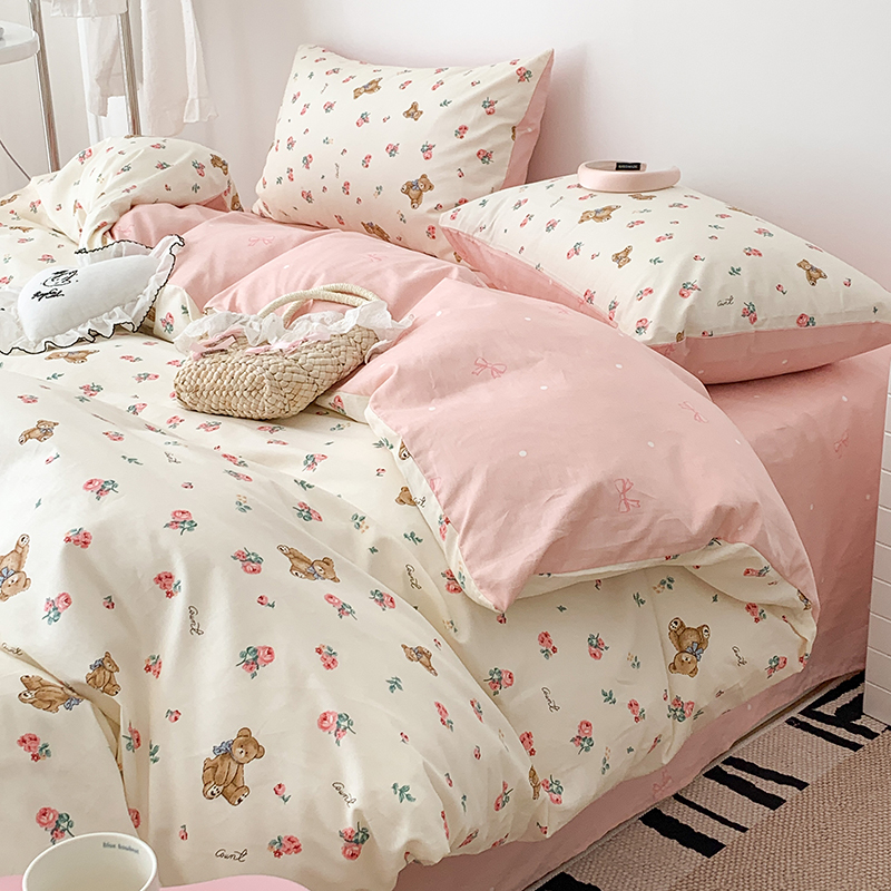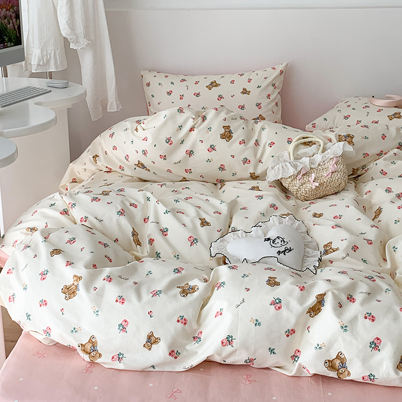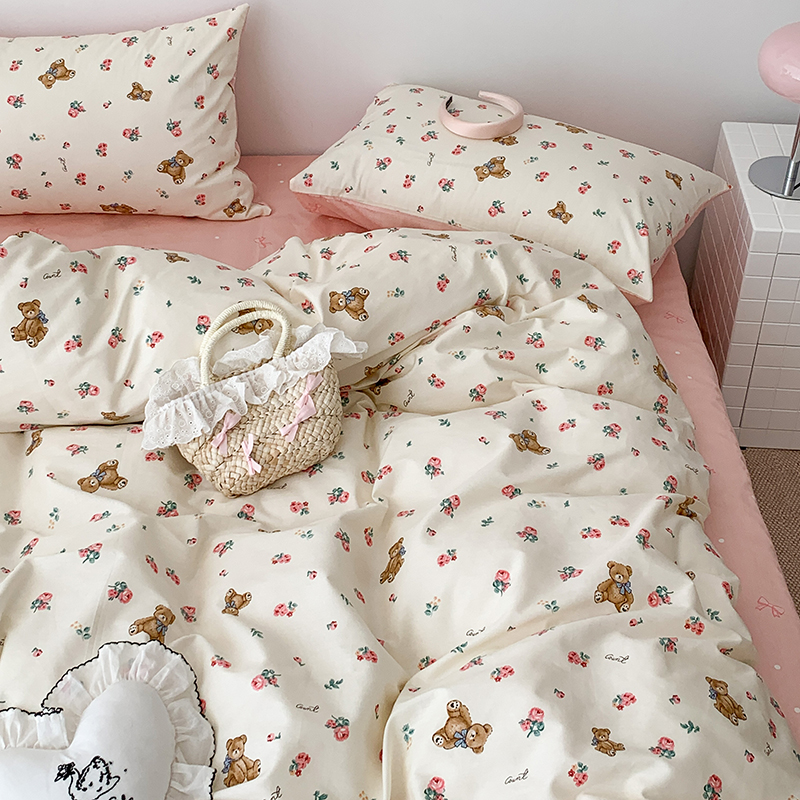 商品名称:昔可家纺 2023新款全棉怦然心动小花系列四件套 玫瑰小熊公仔