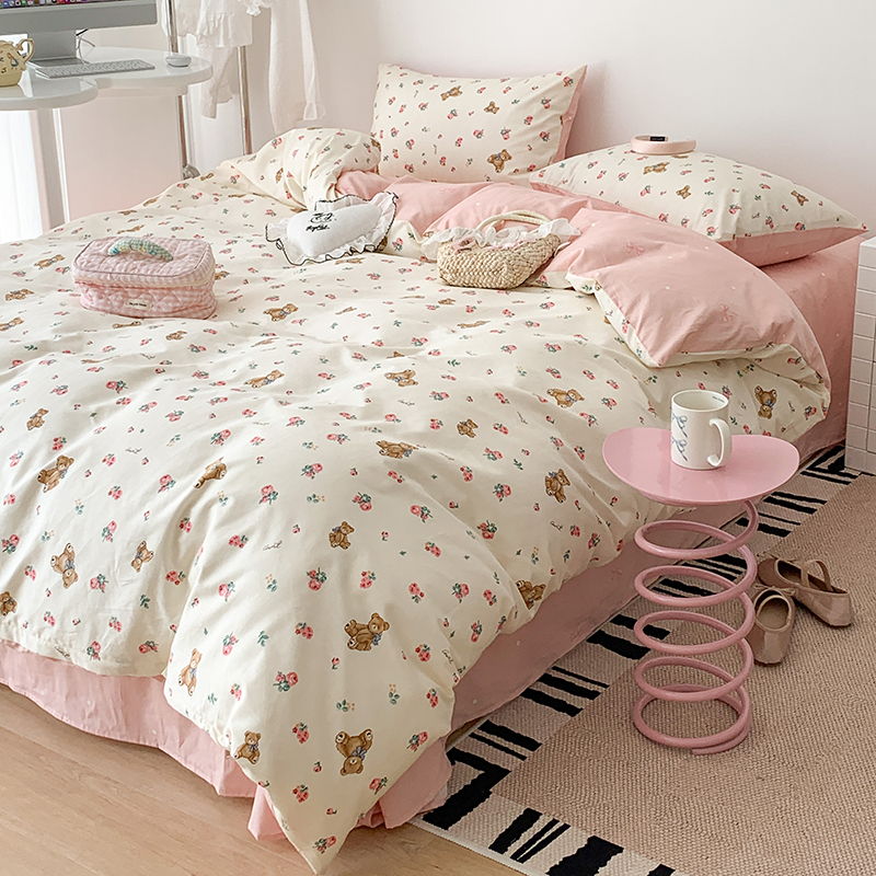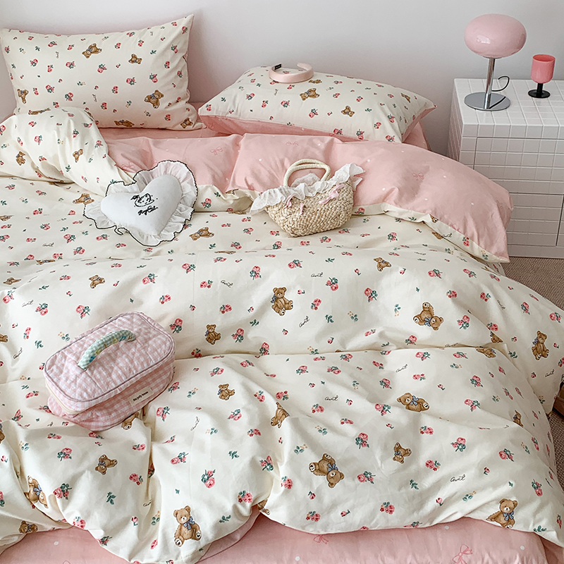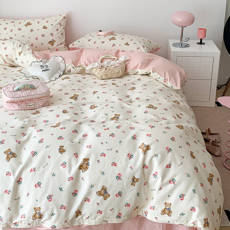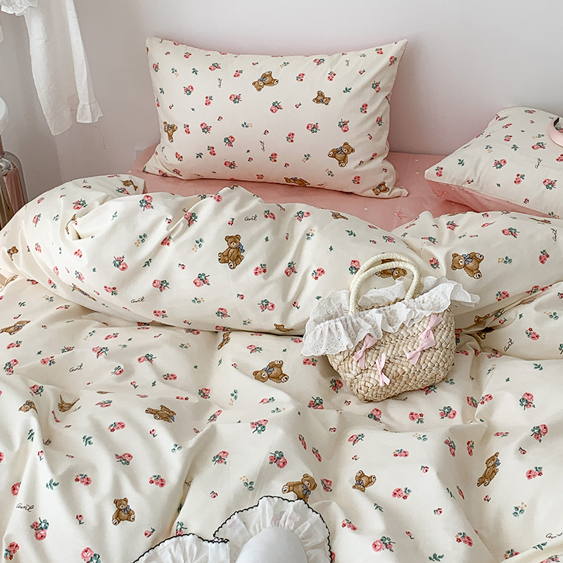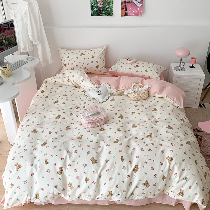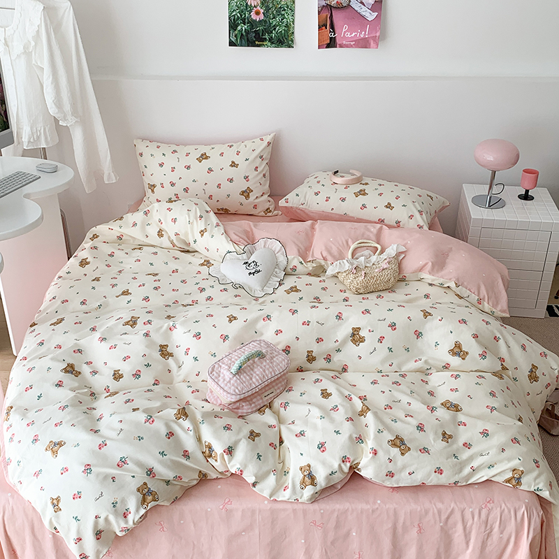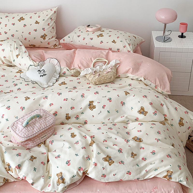 商品名称:昔可家纺 2023新款全棉怦然心动小花系列四件套 玫瑰小熊公仔