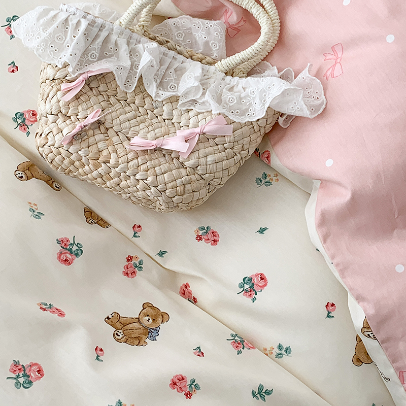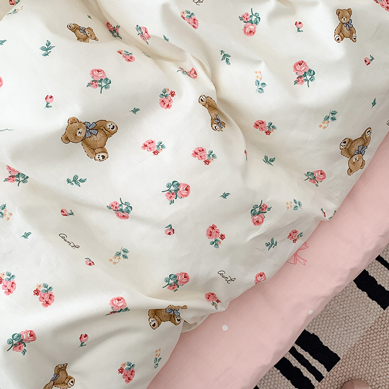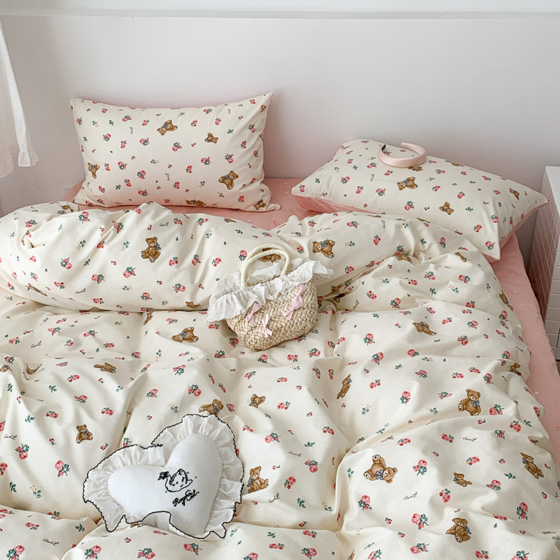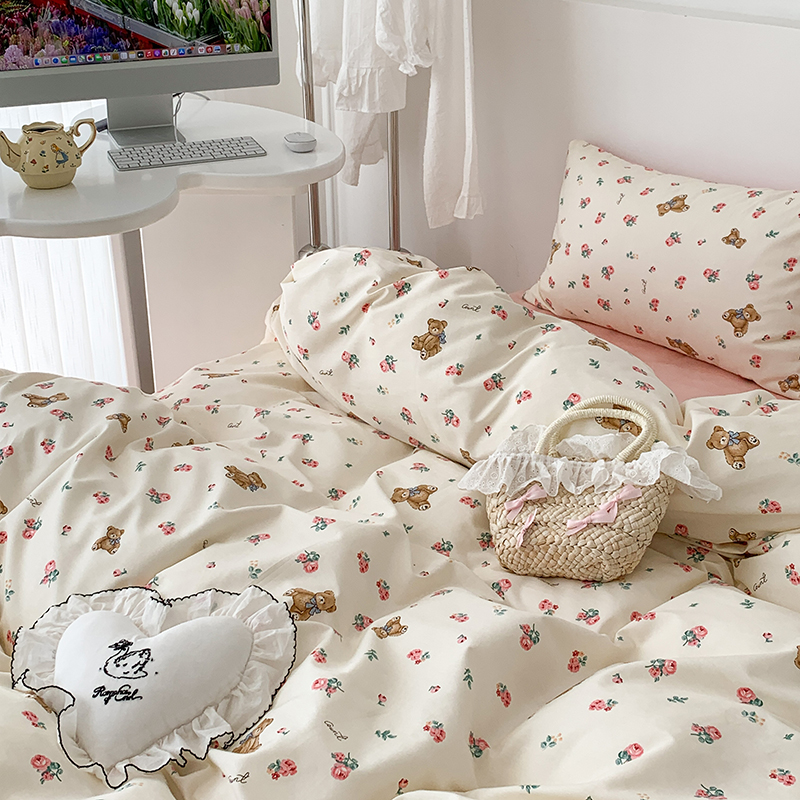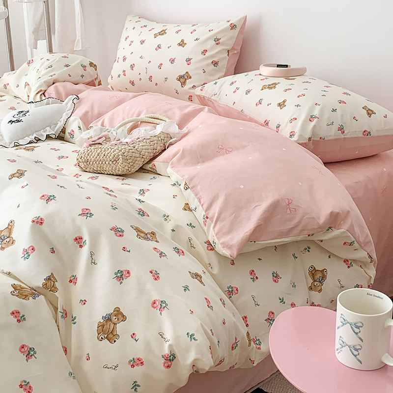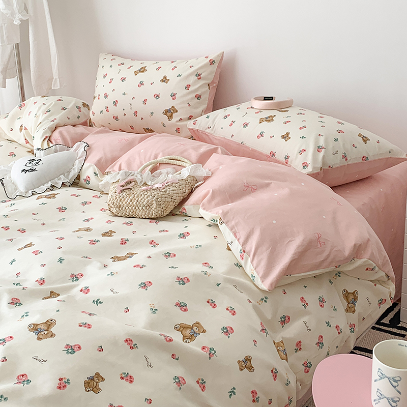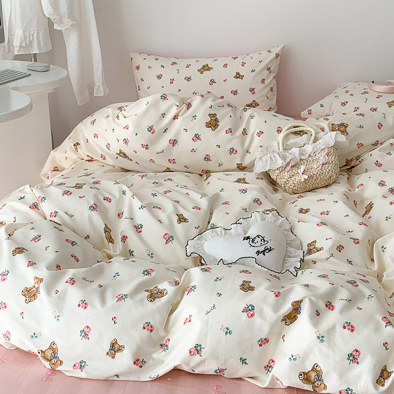昔可家纺 2023新款全棉怦然心动小花系列四件套 玫瑰小熊公仔