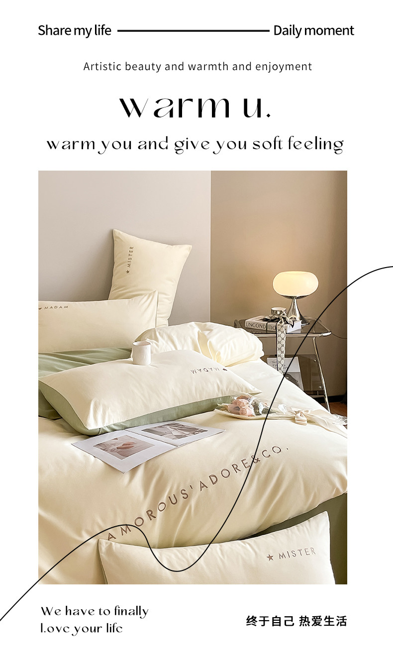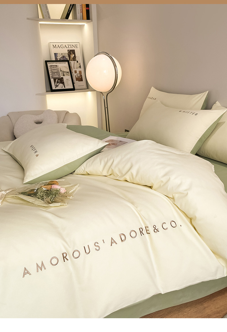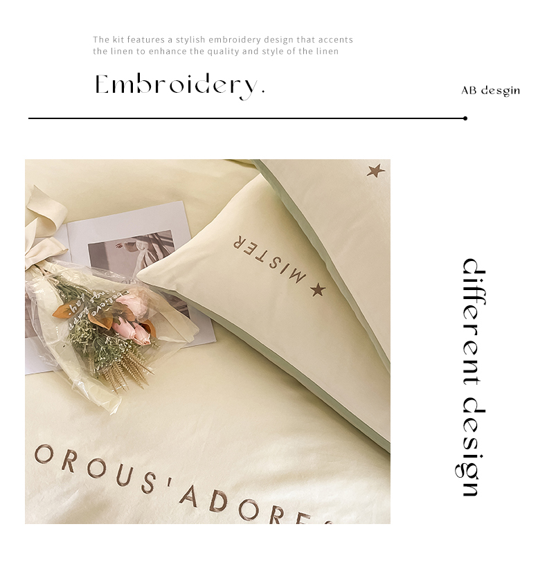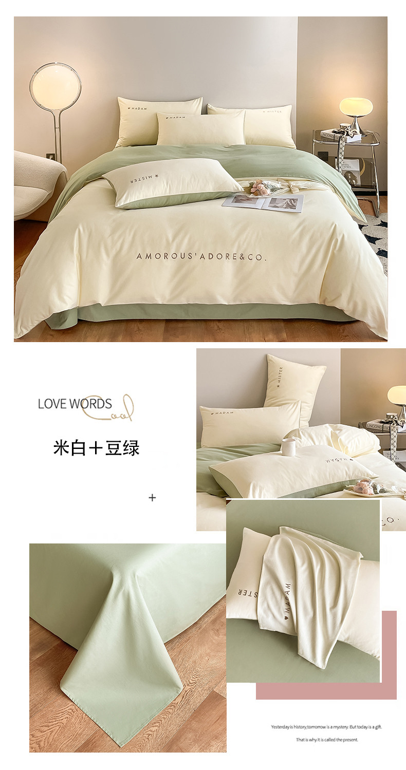 (总)拼社家纺 2025新款母婴及全棉水洗棉刺绣四件套纯棉床上用品,艾玛绿+卡其,繁星蓝+卡其,繁星蓝+玫瑰粉,红豆沙+雅灰,迷雾灰+玫瑰粉,蜜粉+雅灰,奶油白+卡其,奶油白+香橙,牛仔蓝+浅蓝,香橙+雅灰