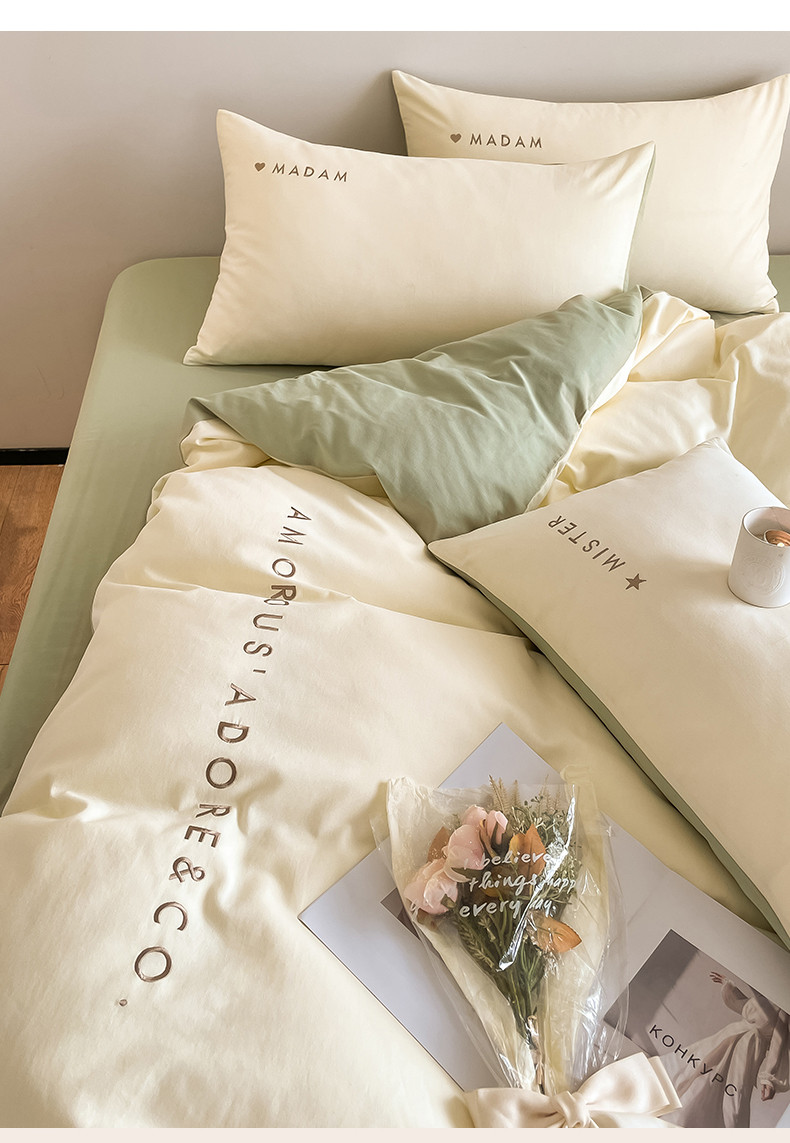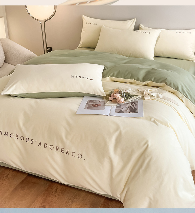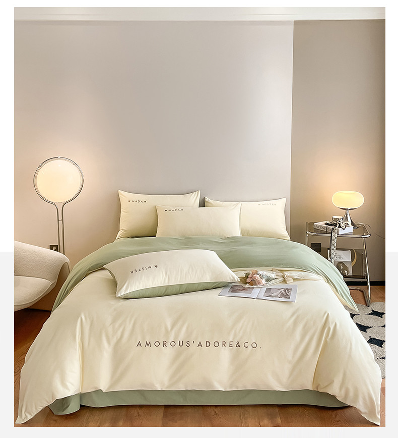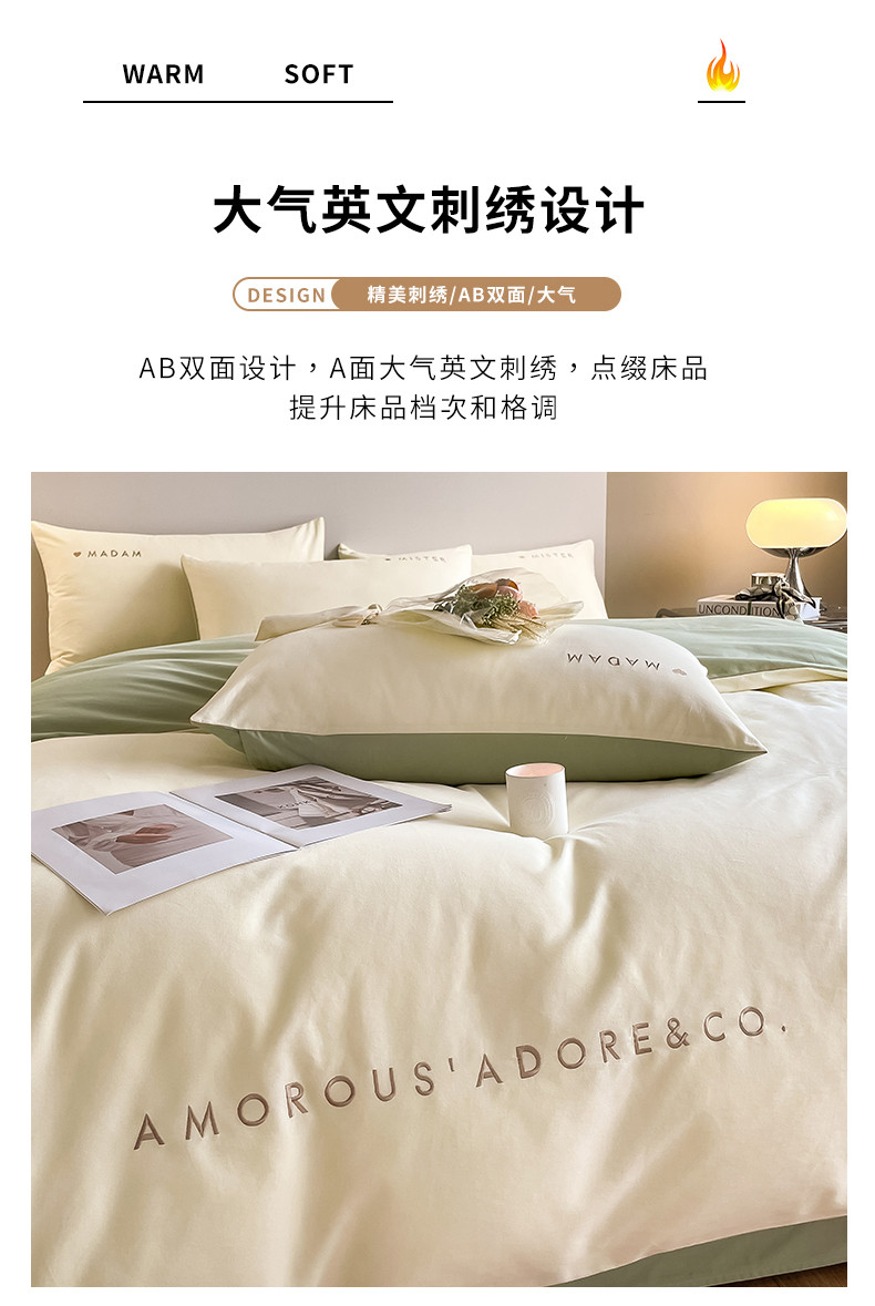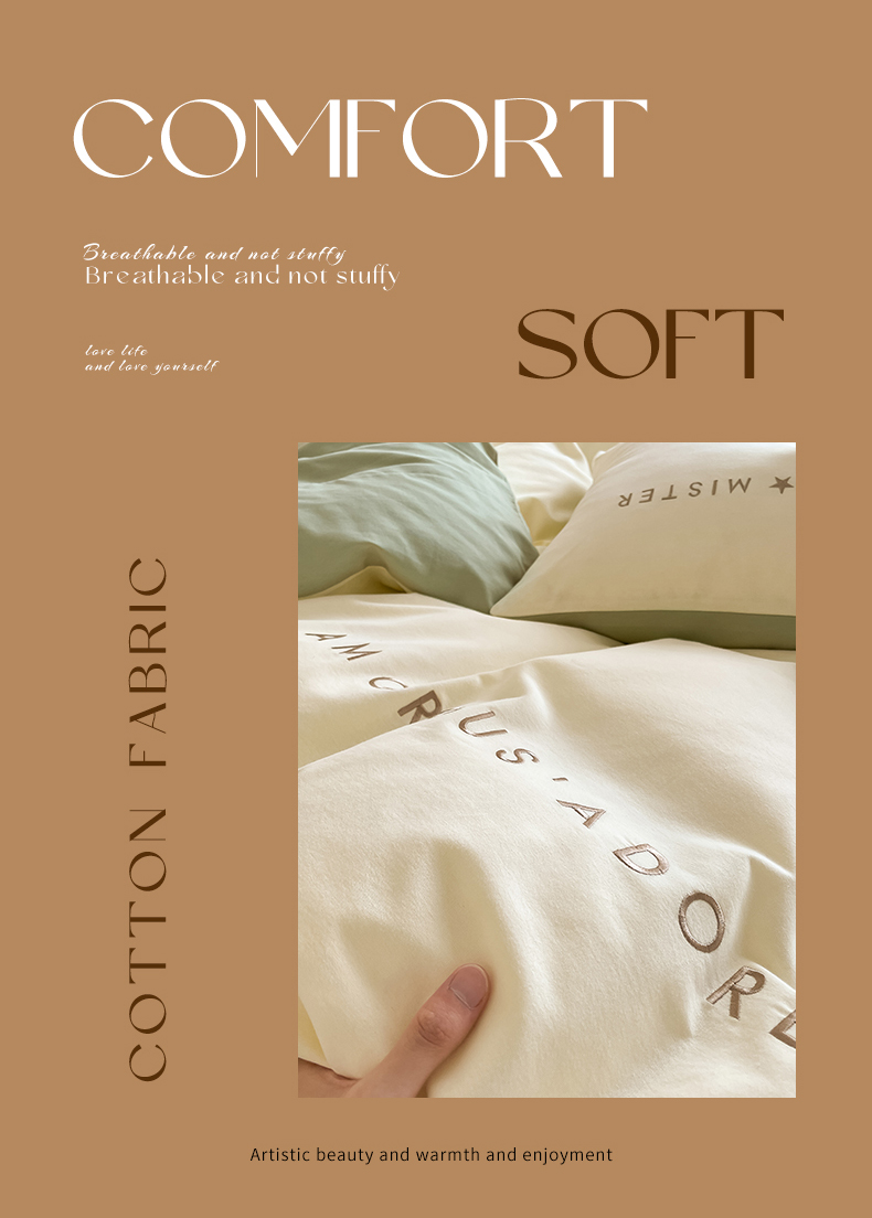 (总)拼社家纺 2025新款母婴及全棉水洗棉刺绣四件套纯棉床上用品,艾玛绿+卡其,繁星蓝+卡其,繁星蓝+玫瑰粉,红豆沙+雅灰,迷雾灰+玫瑰粉,蜜粉+雅灰,奶油白+卡其,奶油白+香橙,牛仔蓝+浅蓝,香橙+雅灰