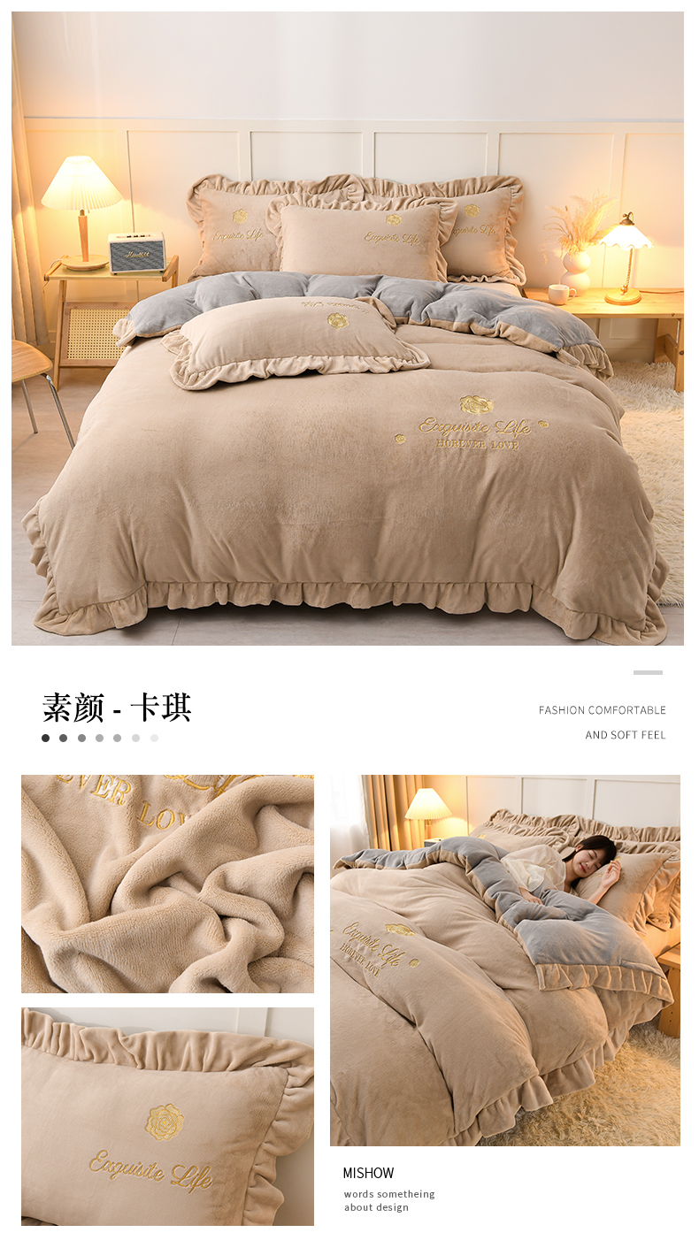 商品名称:氧家 2025款韩版纯色双层花边加厚牛奶绒四件套 素颜-卡琪