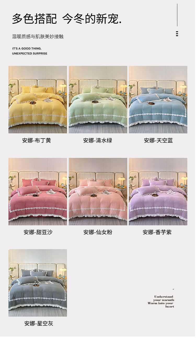 (总)2023新款韩版水溶花边牛奶绒四件套--安娜系列,安娜-布丁黄,安娜-清水绿,安娜-天空蓝,安娜-甜豆沙,安娜-仙女粉,安娜-香芋紫,安娜-星空灰