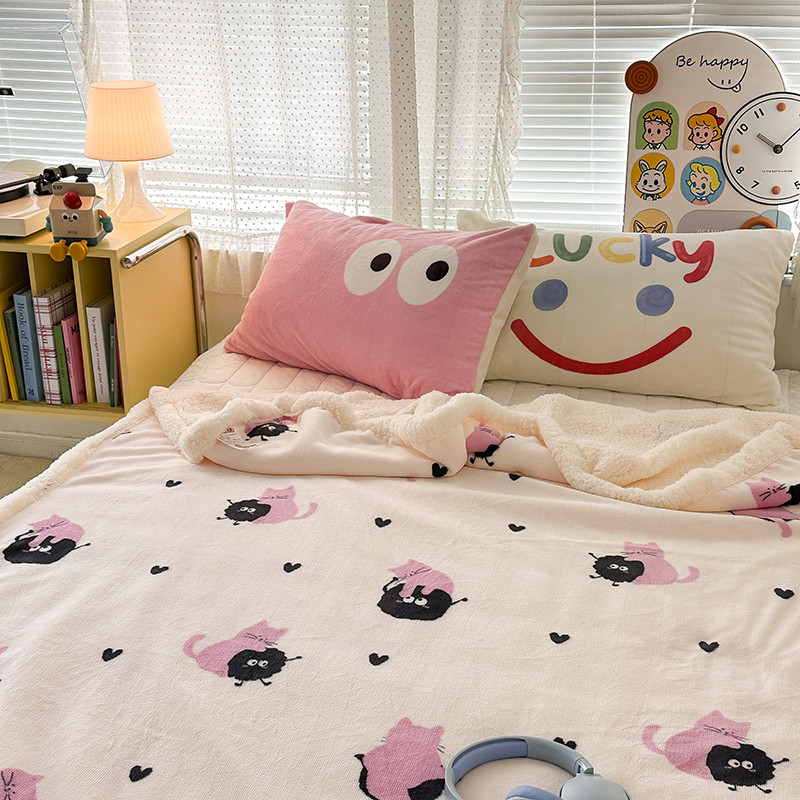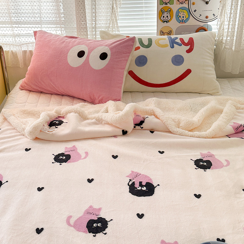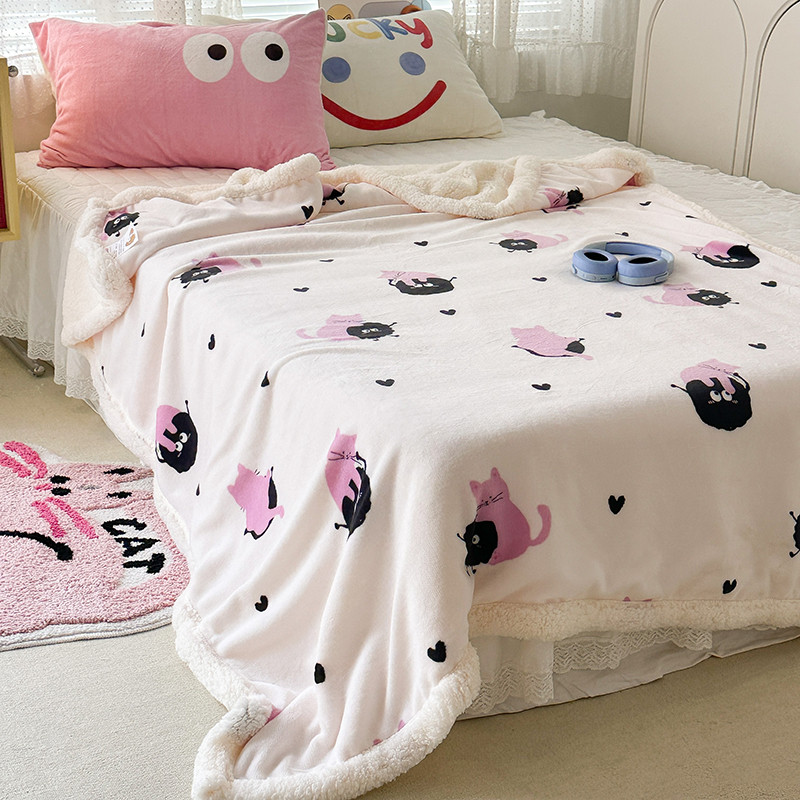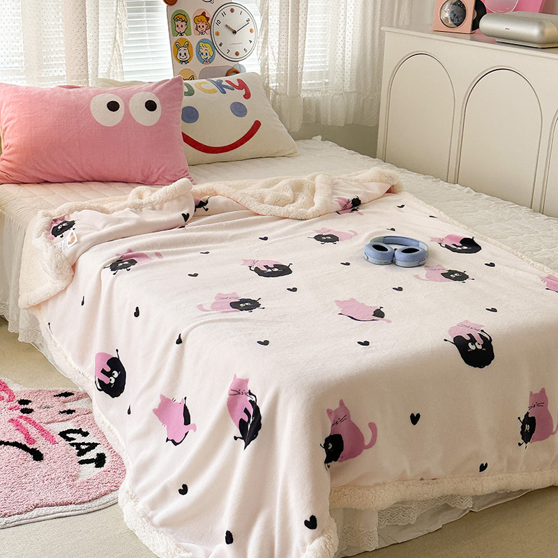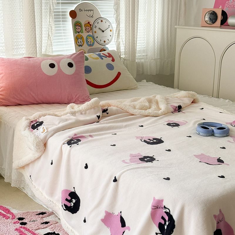 昔可家纺 2023新款ins风牛奶绒羊羔绒印花毛毯(风格一)粉猫煤球