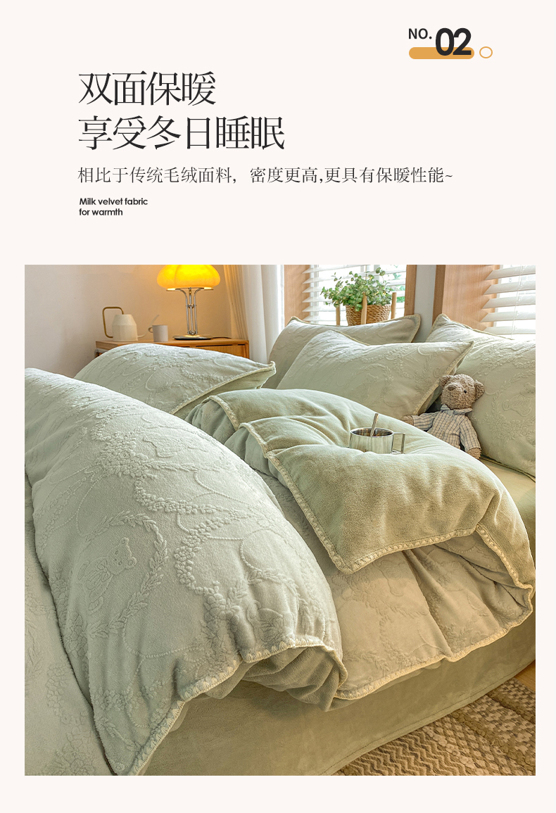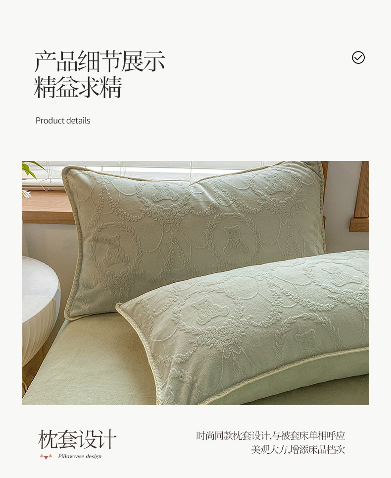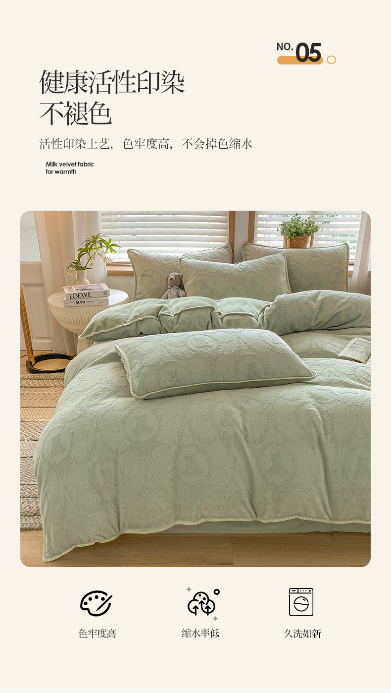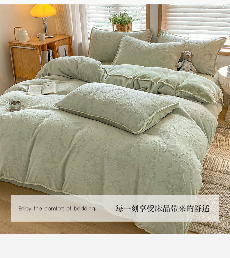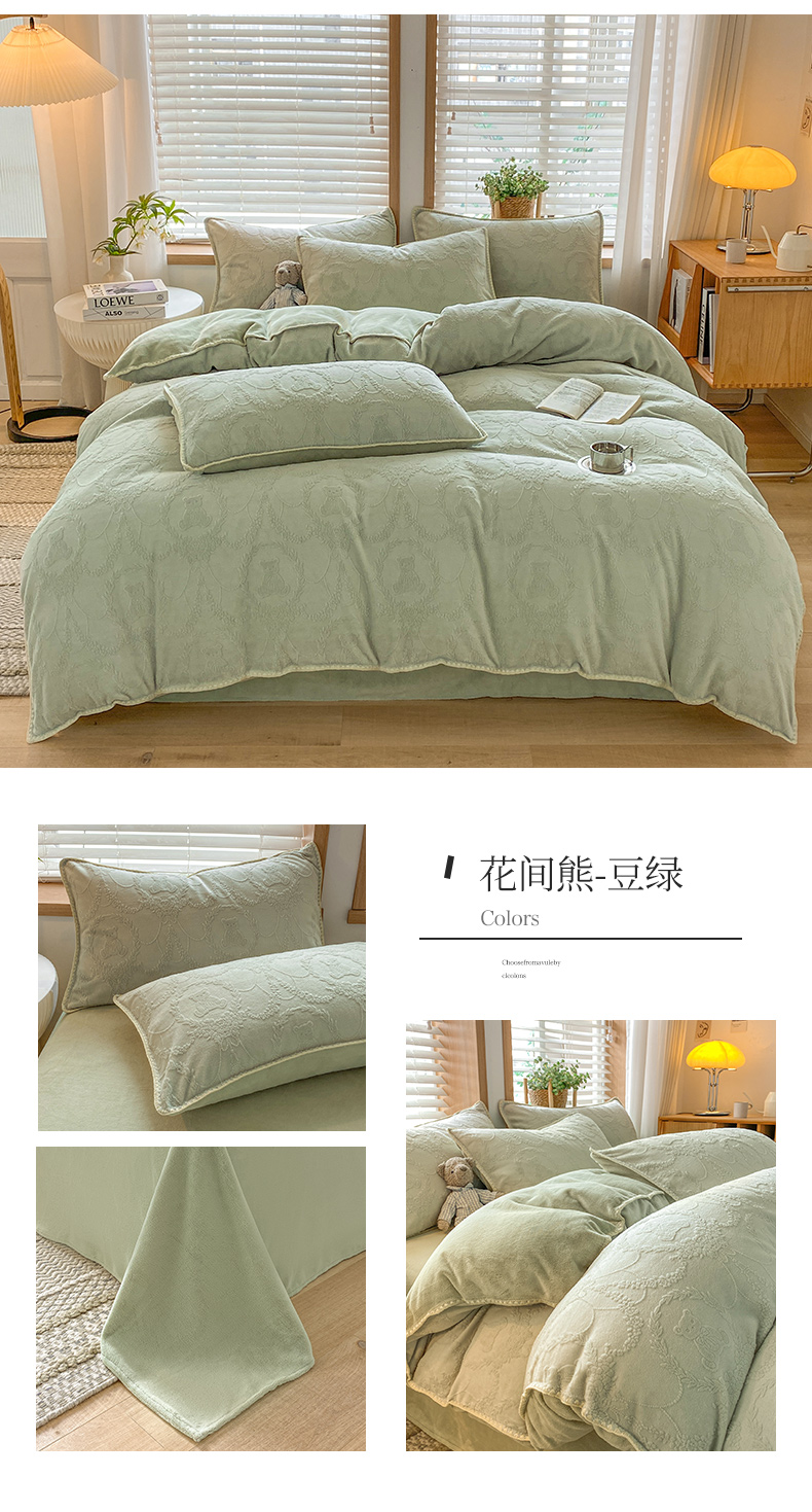 商品名称:A类烂花雕花高克重加厚牛奶绒四件套三角贝壳边工艺 花间熊-豆绿