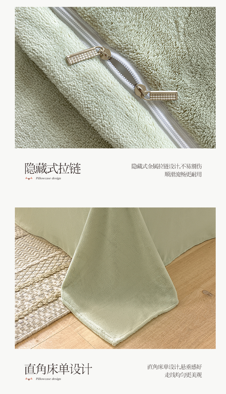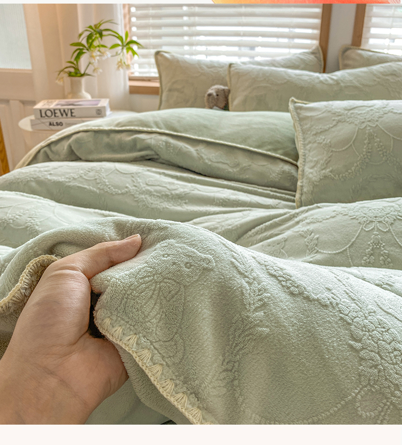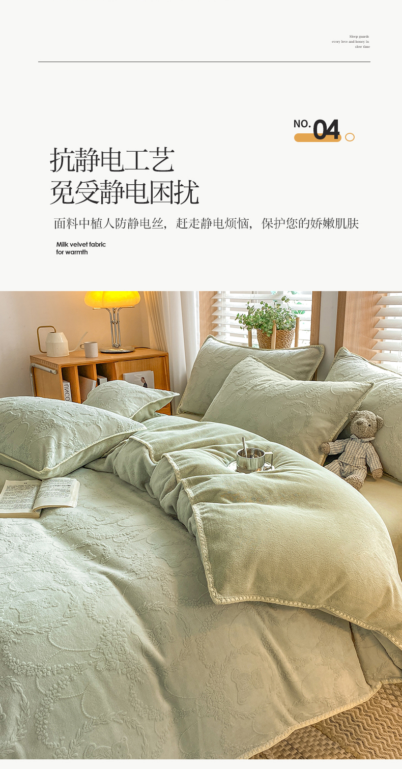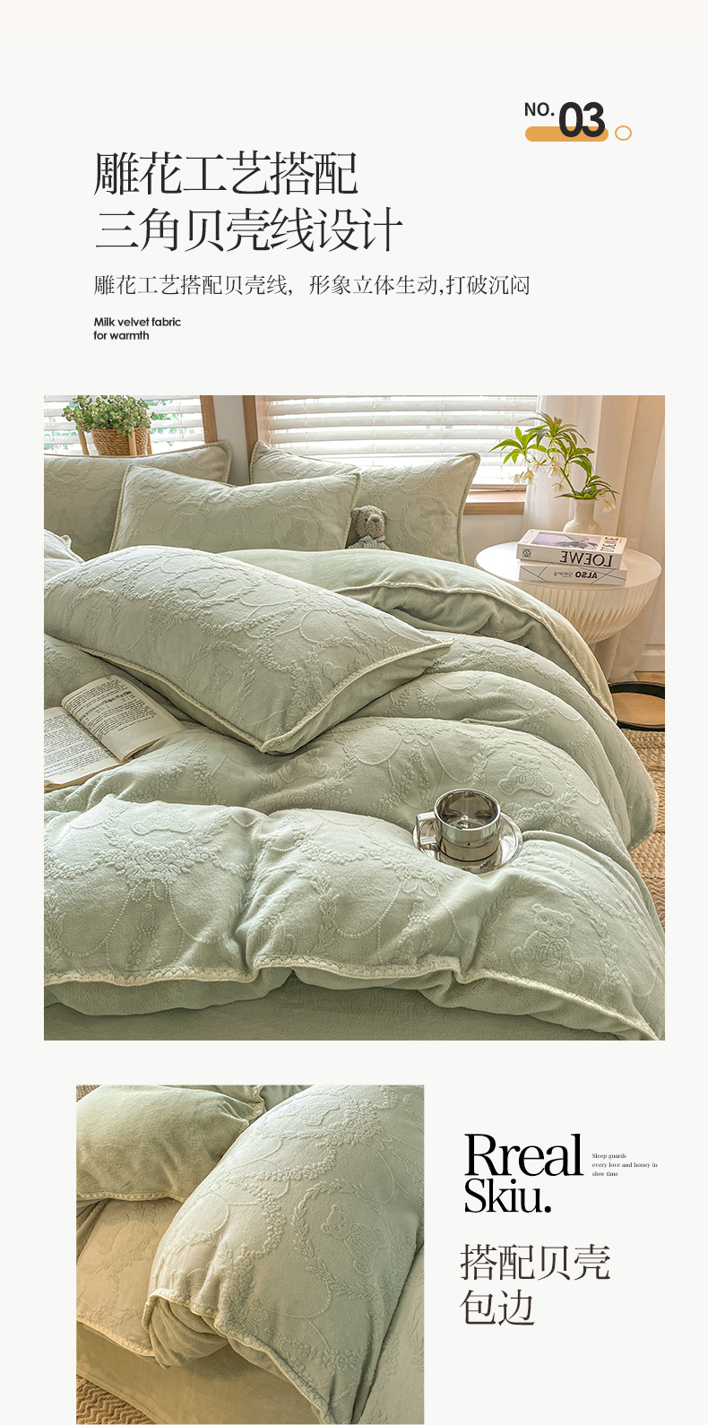 商品名称:A类烂花雕花高克重加厚牛奶绒四件套三角贝壳边工艺 花间熊-豆绿