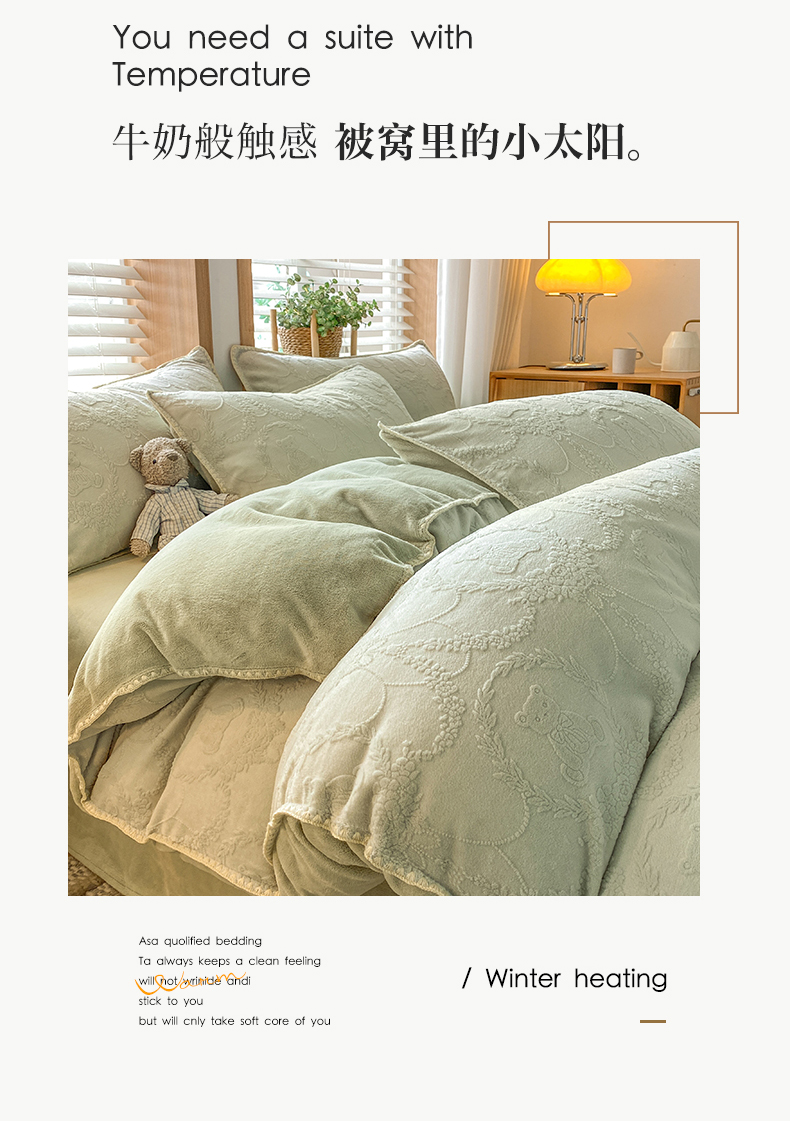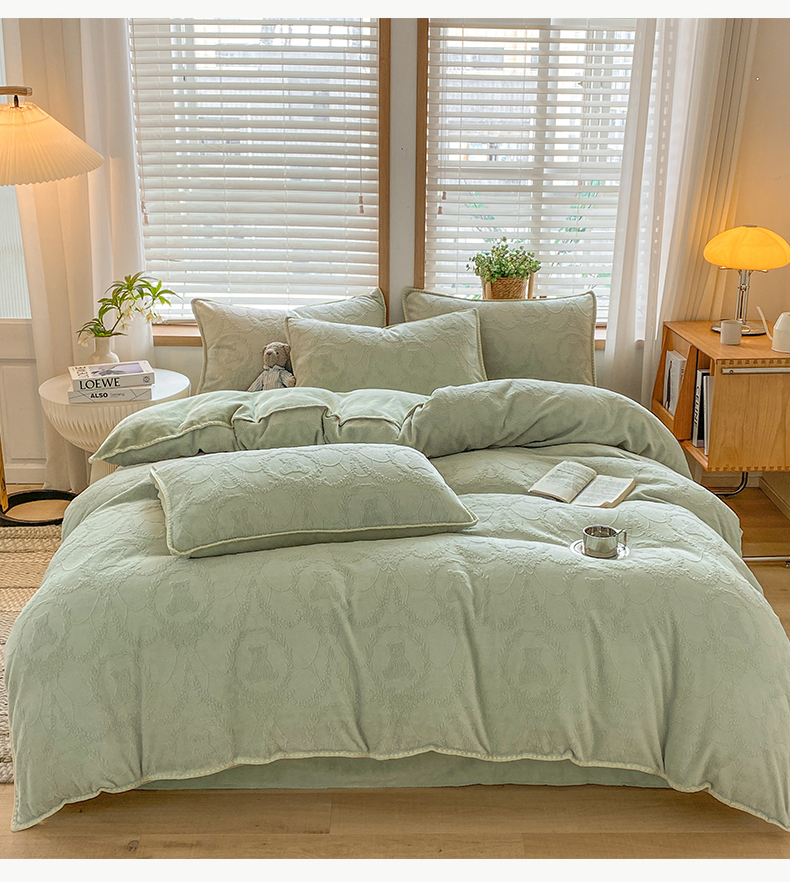 A类烂花雕花高克重加厚牛奶绒四件套三角贝壳边工艺 花间熊-豆绿