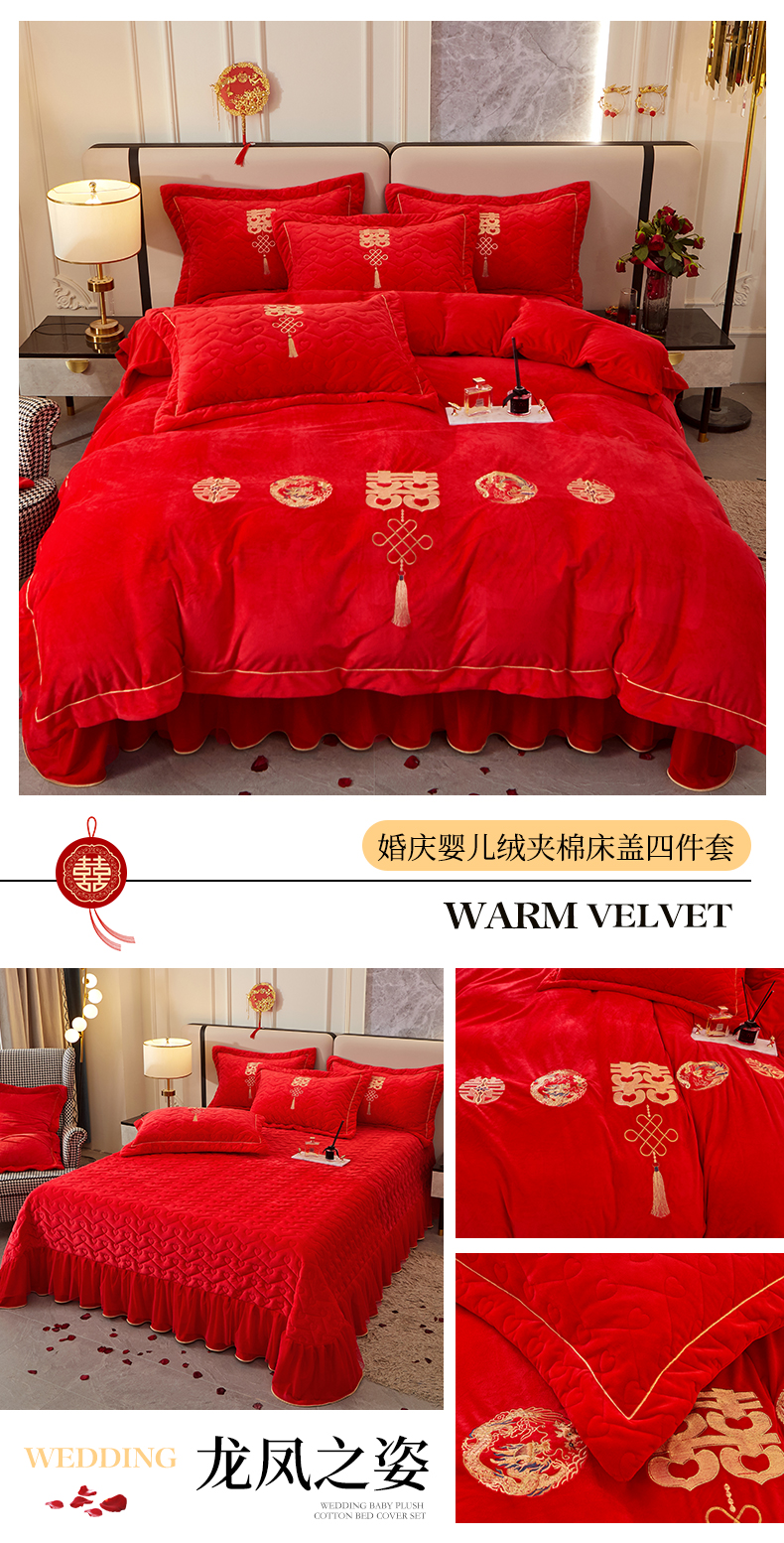 当前位置: 91家纺网 > 商品网购 > 床品套件 > 四件套 > 婚庆四件套 > 宜凡家纺 2023秋冬新品婴儿绒婚庆床盖四件套 龙凤之姿