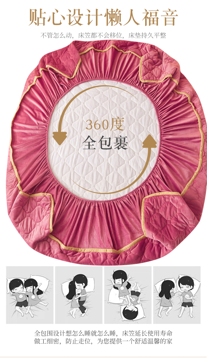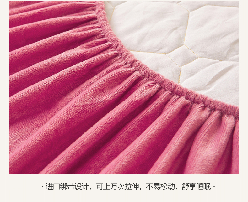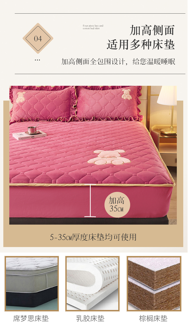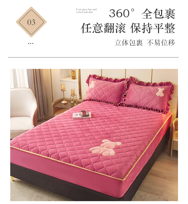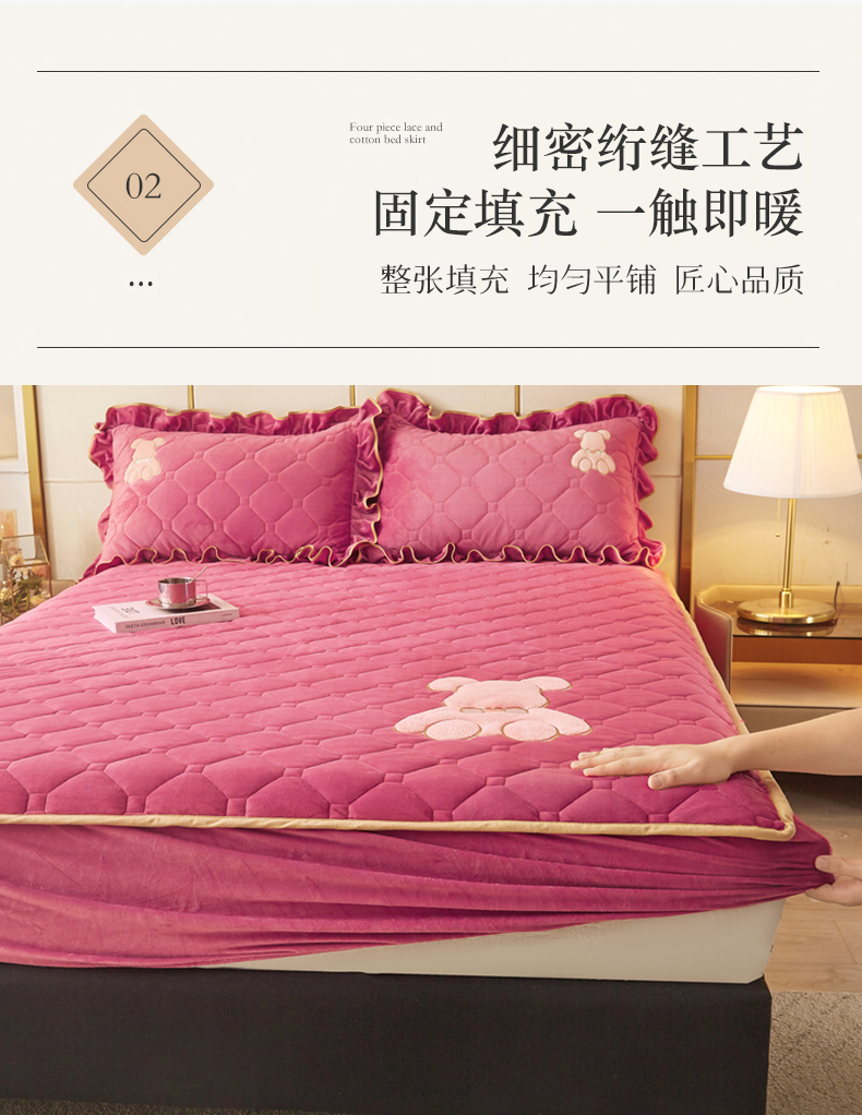 (总)屹成家纺2025新款水晶绒夹棉绗缝蕾丝床裙三件套(塞纳河畔)床裙单件起售价不低于105元,大红,豆沙,翡翠绿,粉玉,橄榄绿,蔚蓝,银灰