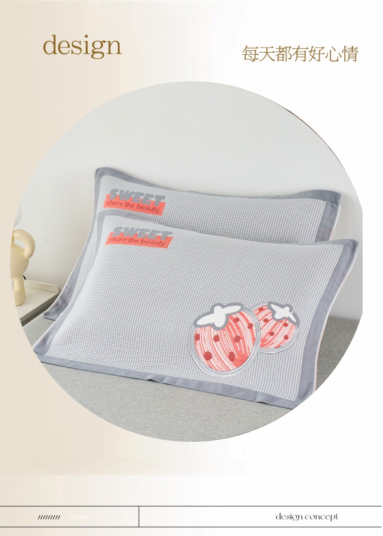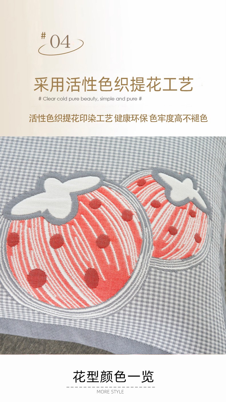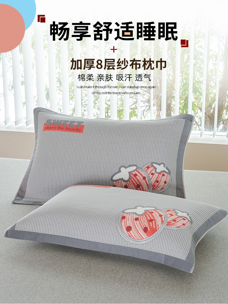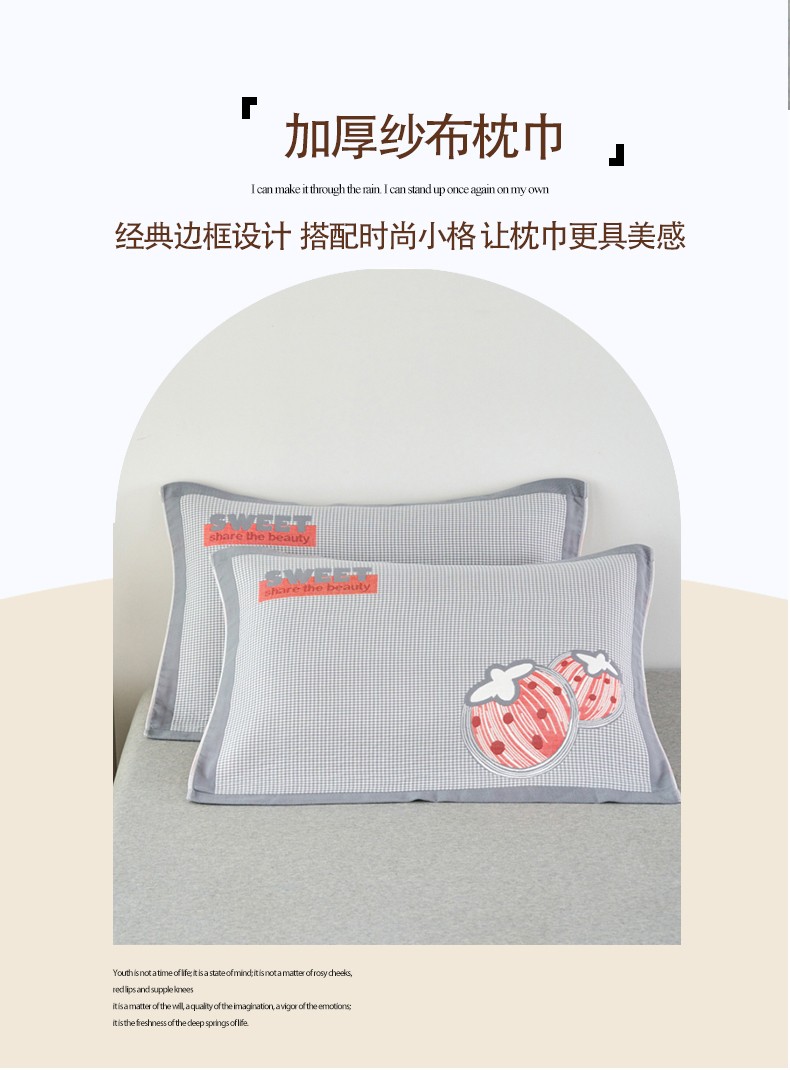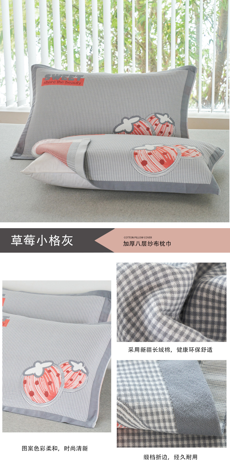 商品名称:棠薇2023新款加厚八层纯棉纱布枕巾一对装小清新小格子系列全棉枕头盖巾 草莓小格灰52*78±2cm