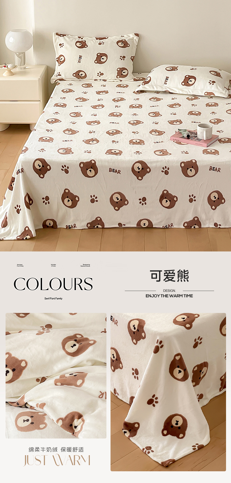 商品名称:时光里 2023新款全消光加厚牛奶绒印花单品单床单 可爱熊