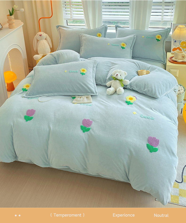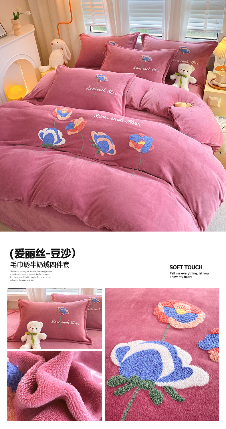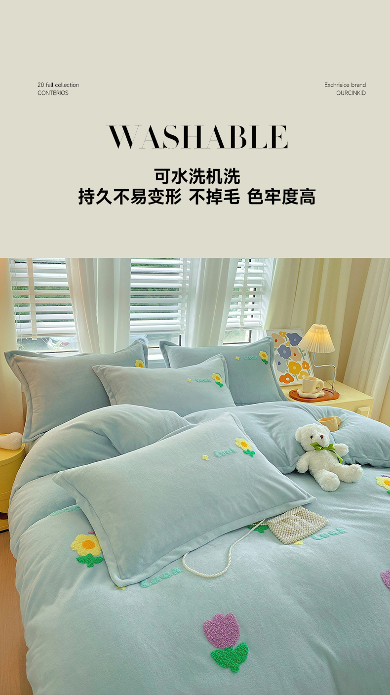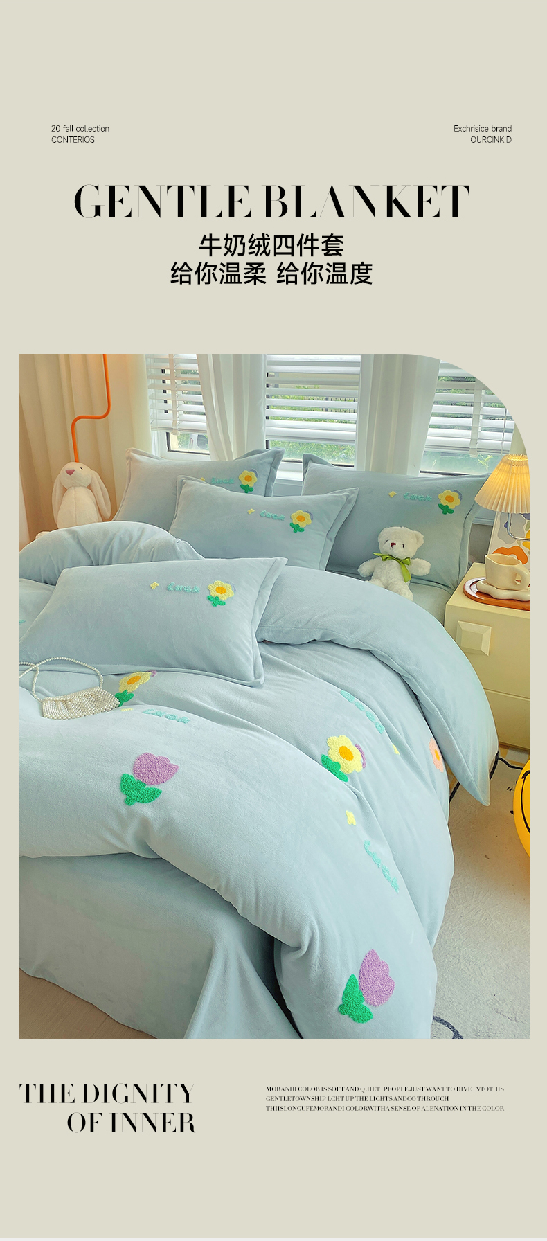 (总)凡客家居 2024新款高克重牛奶绒绣花拼角四件套,海洋蓝,奶油咖,深卡其,樱花粉