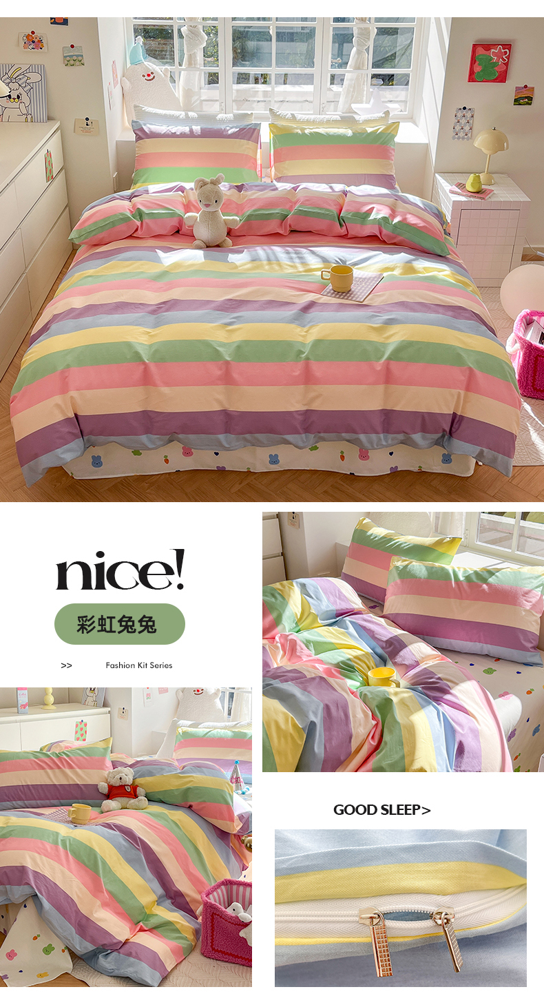 商品名称:怡家居 2024新品春款全棉印花四件套第一批花色-卡通类 彩虹兔兔