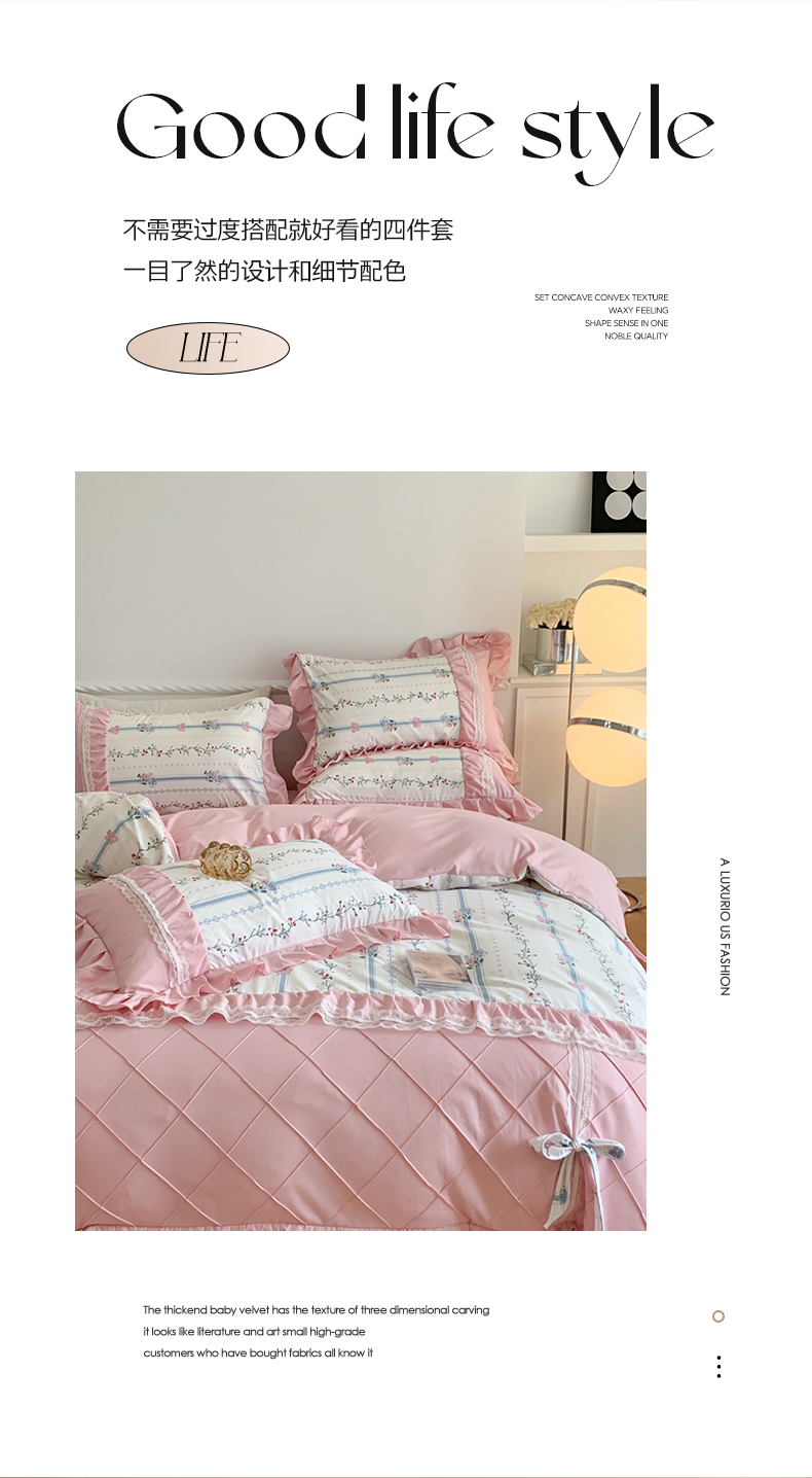 (总)吾欢心 2025秋冬新款加厚雕花绒婴儿绒安娜贝尔系列法式双层花边四件套,安娜贝尔白,安娜贝尔粉,安娜贝尔咖,安娜贝尔蓝,安娜贝尔绿,安娜贝尔紫