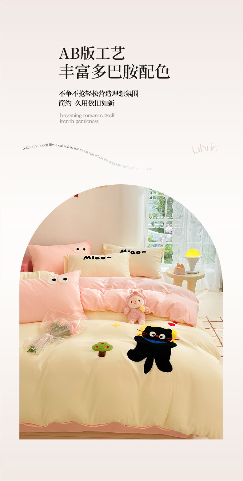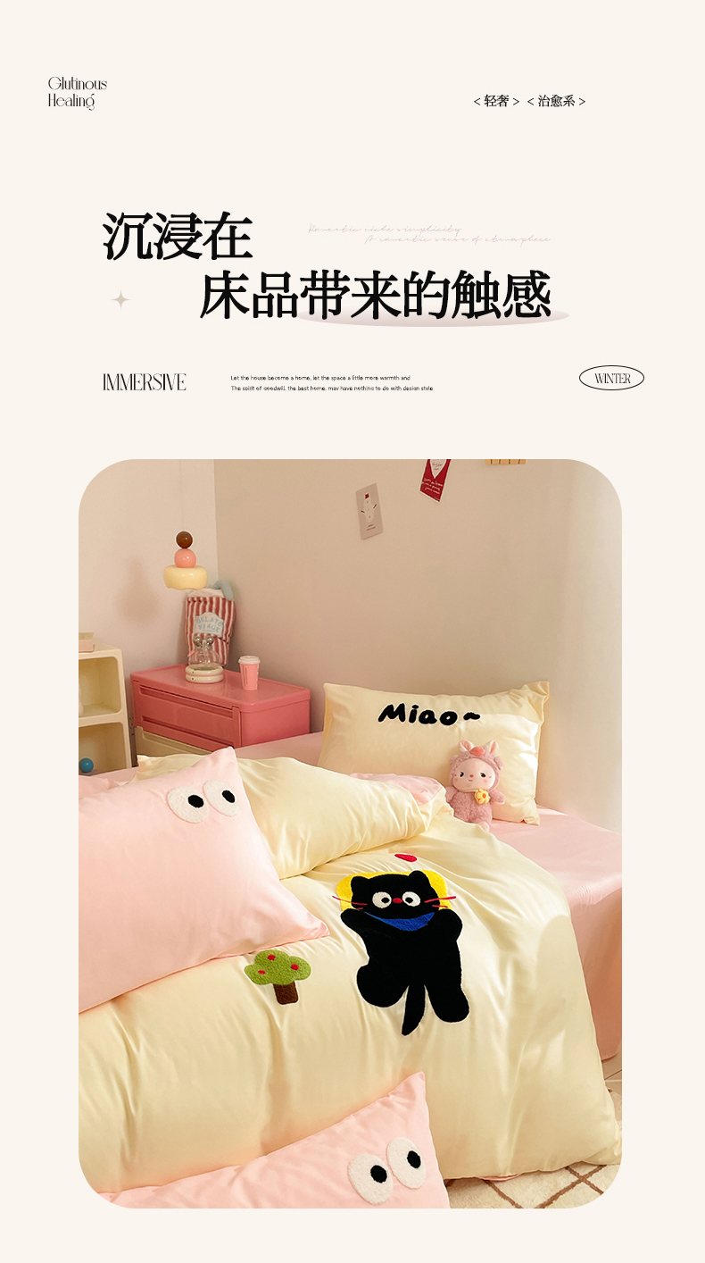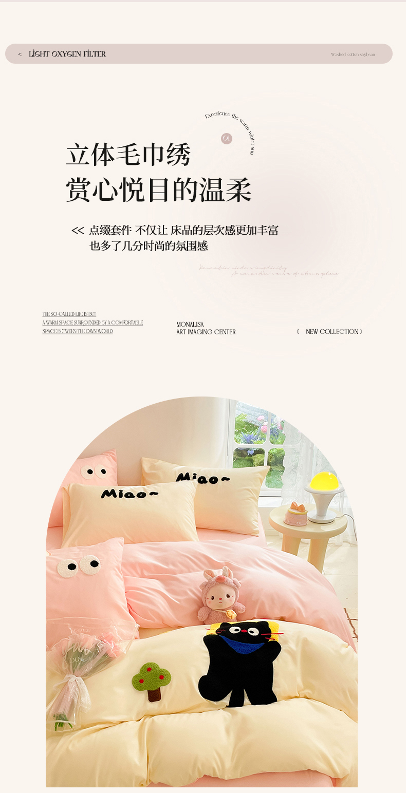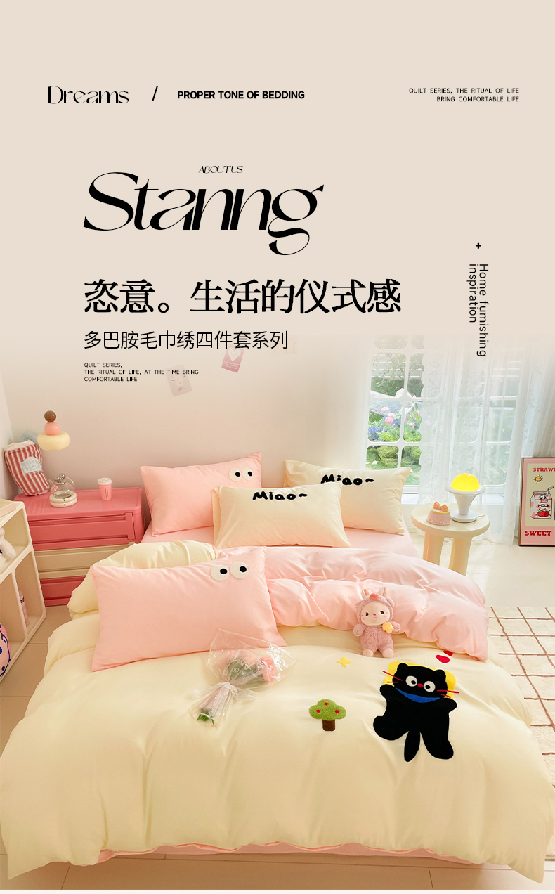 当前位置: 91家纺网 > 商品网购 > 床品套件 > 四件套 > 水洗棉四件套 > 我心家纺 2024新款亲肤多巴胺水洗棉毛巾绣四件套 贪睡猫-米粉