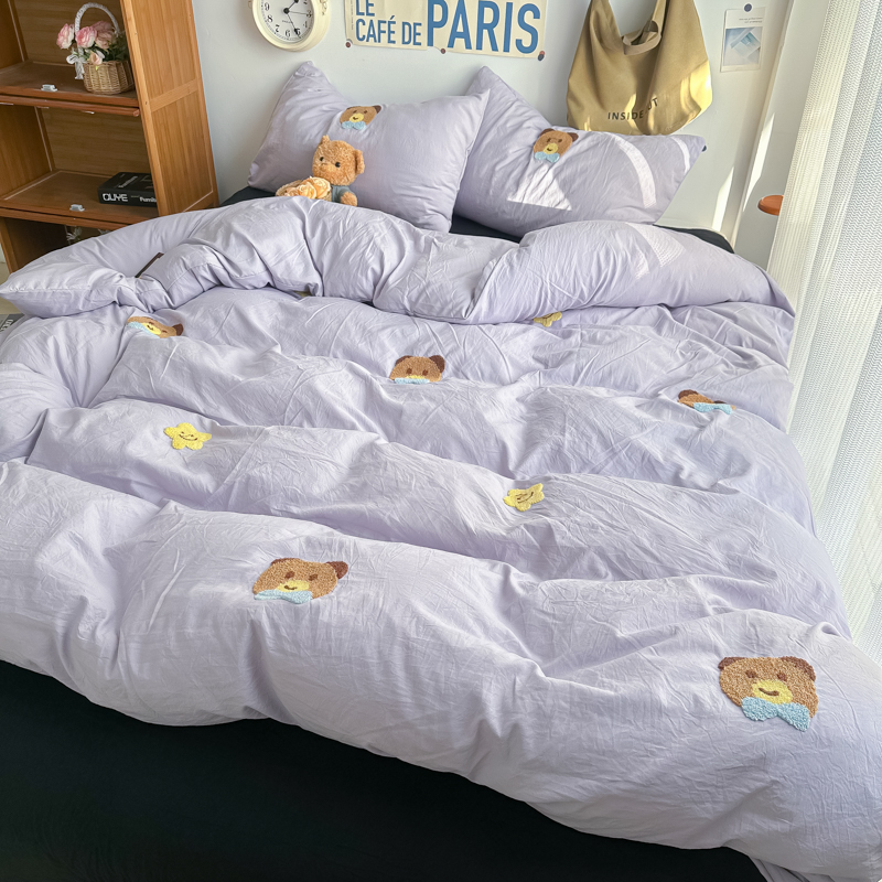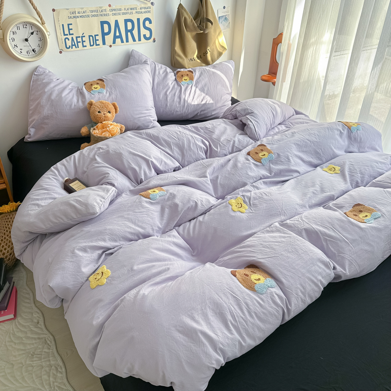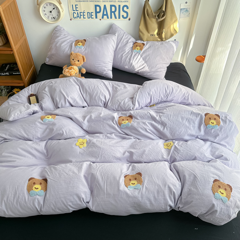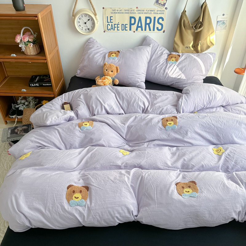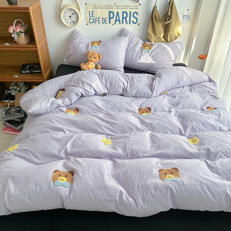 商品名称:雨帆家纺 2024新款水洗棉卡通系列毛巾绣四件套-小熊系列 紫小熊