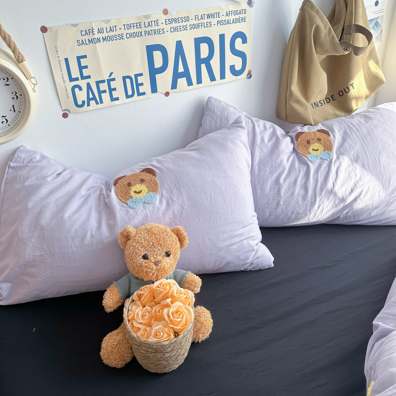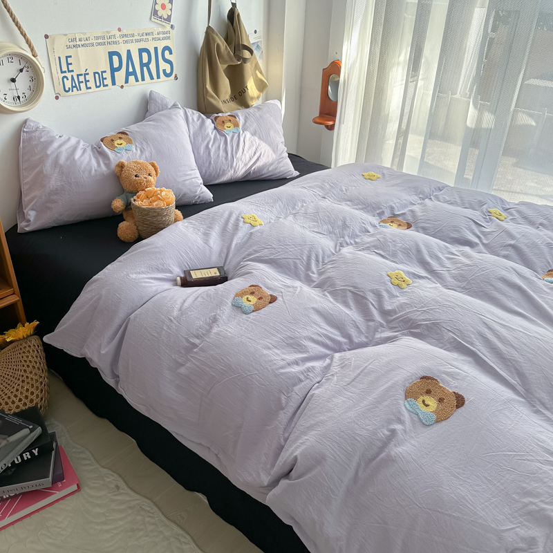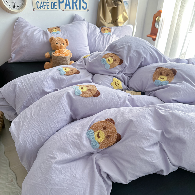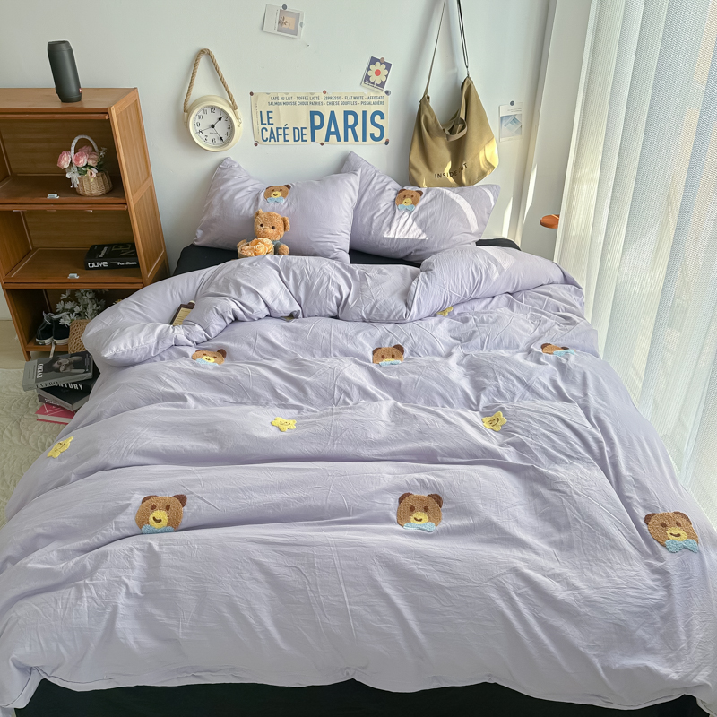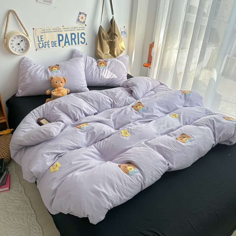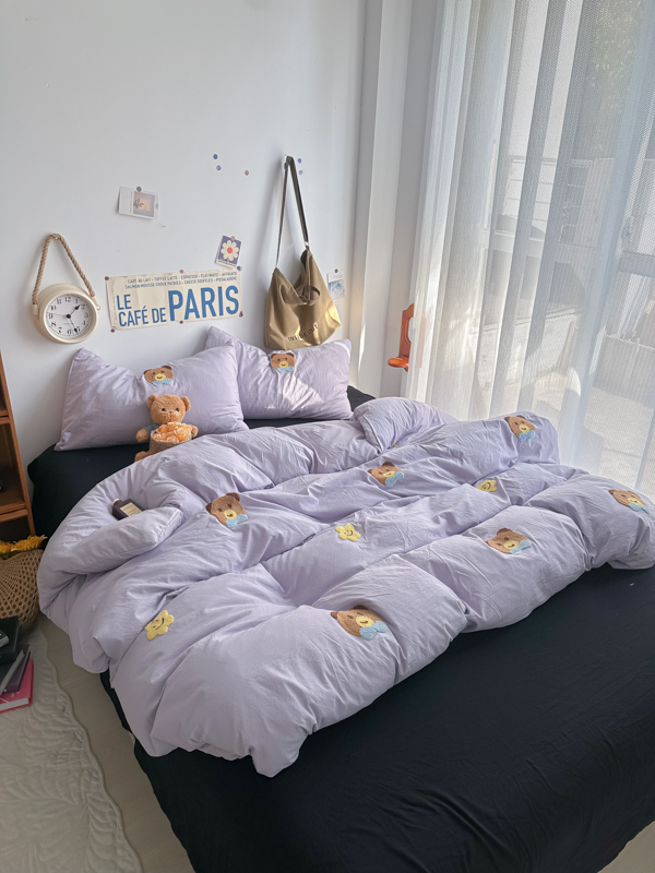 商品名称:雨帆家纺 2024新款水洗棉卡通系列毛巾绣四件套-小熊系列 紫小熊