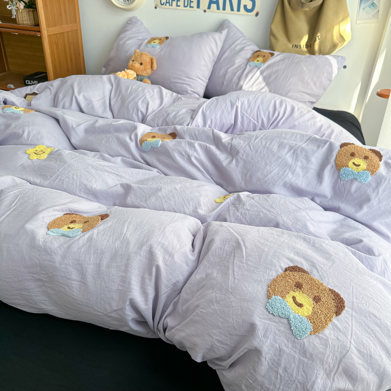 雨帆家纺 2024新款水洗棉卡通系列毛巾绣四件套-小熊系列 紫小熊