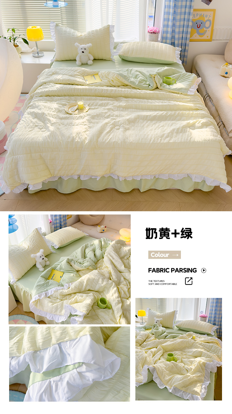 当前位置: 91家纺网 > 商品网购 > 床品套件 > 四件套 > 夏被四件套 > 颜选 2024新款泡泡纱花边夏被单品夏被四件套 奶黄+绿