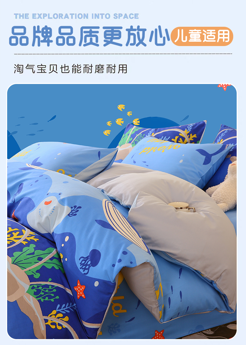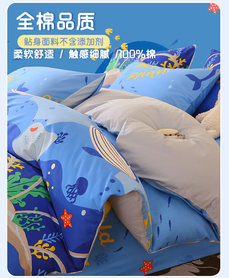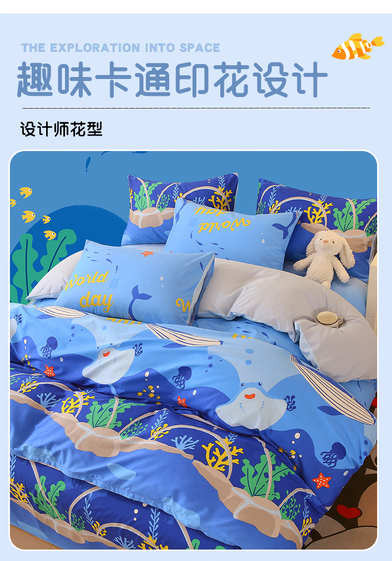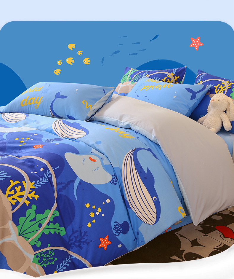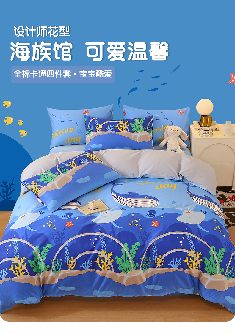 当前位置: 91家纺网 > 商品网购 > 床品套件 > 三件套 > 金鑫汇家纺 2024新款全棉印花四件套 海族馆